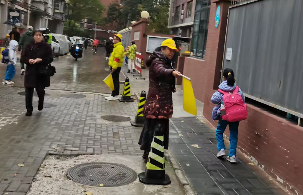 孙女的姥姥接送孩子上学。我对她说了这件事。她很惊讶,她每天都能看到一位女士很负责任地维持秩序,最近胳臂缠了绷带。以为是学校的老师或是志愿者。第二天,她特意拍了一张照片,感慨道:学校的领导关爱学生细致入微,胳膊摔伤了,打着绷带,拿着小旗忙前忙后。孩子在这样的学校读书,家长放心。