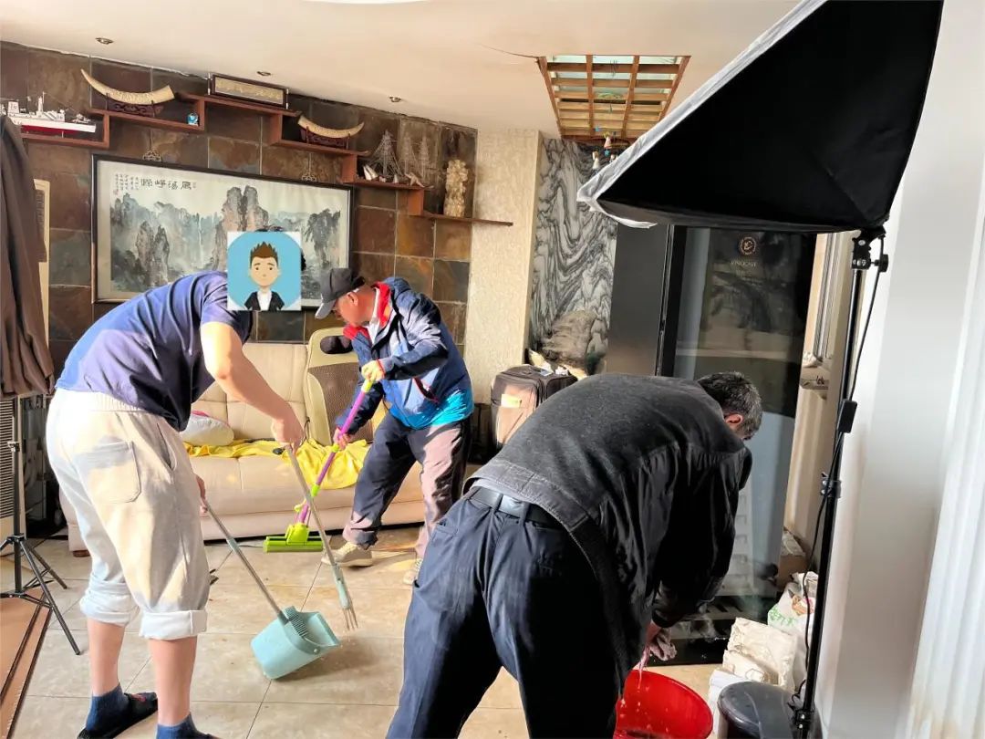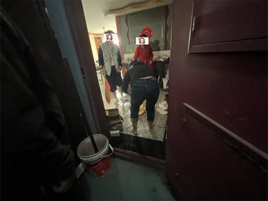两人心急如焚,一路小跑着直奔现场。到达现场后,只见屋内水流成河,积水已经没过了脚踝。孟庆英来不及多想,立刻加入到扫水的工作中。由于水较深,鞋子踩在水里不仅行动不便,还会影响扫水效率,孟庆英果断脱了鞋袜,不顾水凉,赤脚踏入水中。冰冷的水瞬间包裹住她的双脚,但她顾不上这些,只想着尽快把水扫出去,减少居民的损失。