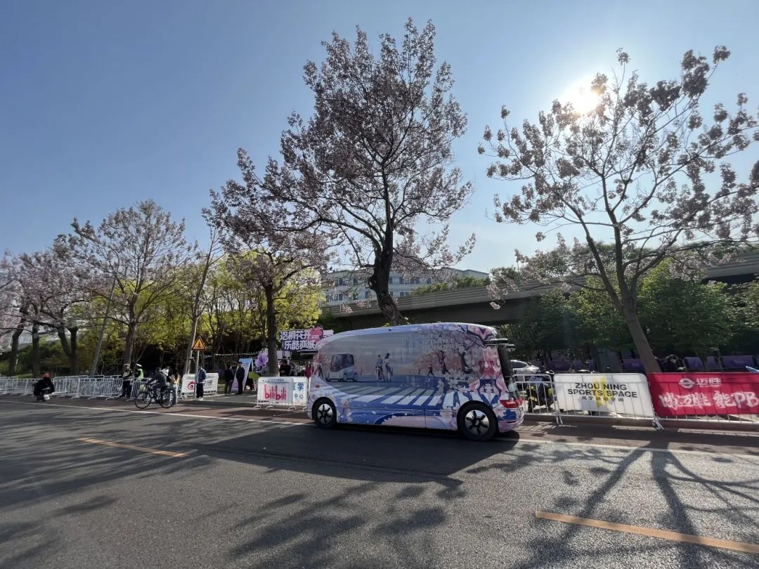 “智享桐趣”花车以2025泡桐花季的主视觉及泡桐花元素进行包装,将自动驾驶小巴打造成了泡桐花季的专属花车。车身上装饰着淡紫色的泡桐花图案,将春天的气息融入花车的每一寸“皮肤”。车内采用会议模式,配备会议桌、展示屏等,可供开展商务洽谈或工作会议,会议桌下还设置了冷藏室和暖柜。在“智享桐趣”花车上,乘客可以一边品茶一边工作,通过车内屏幕展示文件和资料,享受高效便捷的移动办公体验,也可在工作间隙随时享用冷藏饮品或热茶,一边透过车窗欣赏泡桐花的美景,尽享惬意时光。