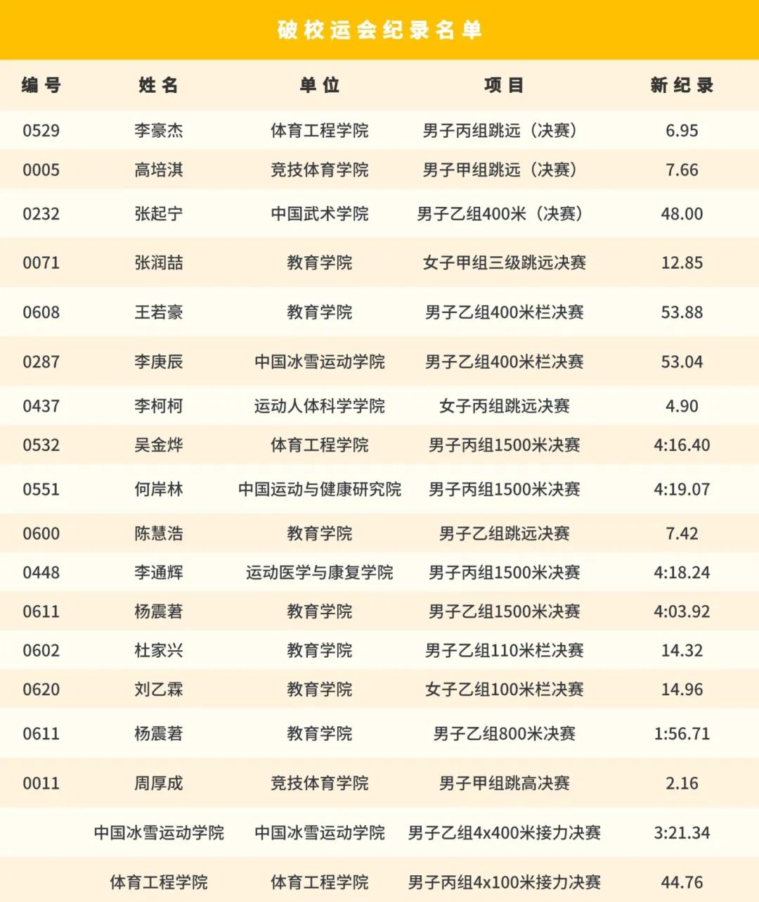 往届北京体育大学田径运动会校纪录