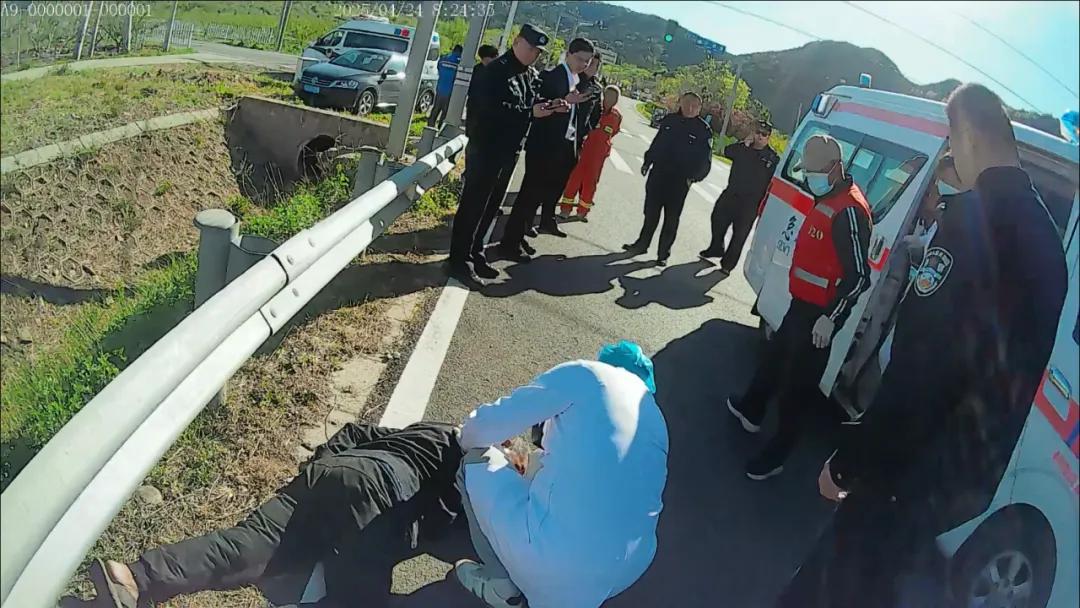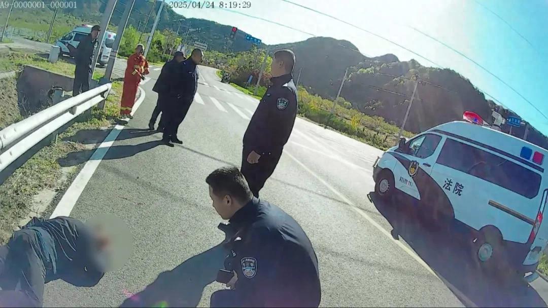 警车立刻行驶至离事故现场约10米处。四名法警跳出车厢,迅速冲向老人,查看伤势,拨打120急救电话和110报警电话。大家默契分工,王贺松快速疏导后方车辆,避免二次伤害,赵镇冰则连忙向附近驻足的围观群众询问是否认识老人。