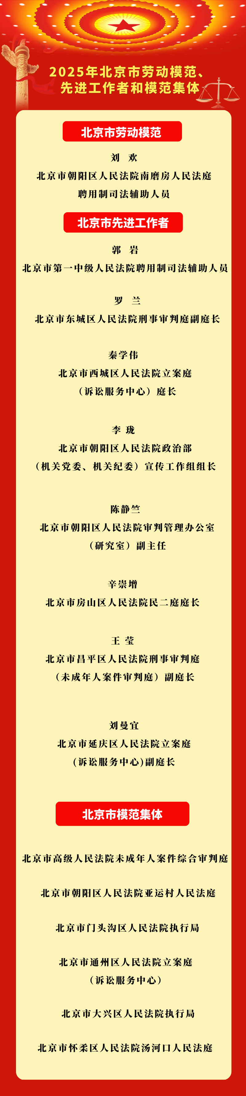 其中,北京市朝阳区人民法院南磨房人民法庭聘用制司法辅助人员刘欢获评北京市劳动模范,北京市第一中级人民法院聘用制司法辅助人员郭岩等8人获评北京市先进工作者,北京市高级人民法院未成年人审判庭等6个单位获评北京市模范集体。