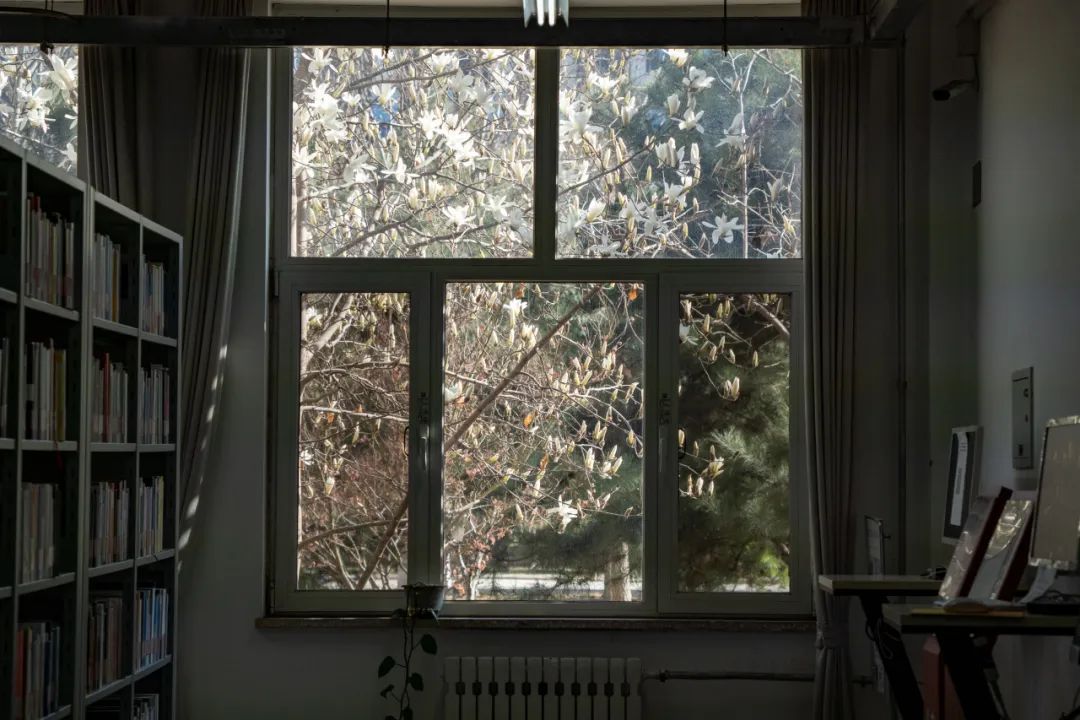 图书馆前,花树静静伫立