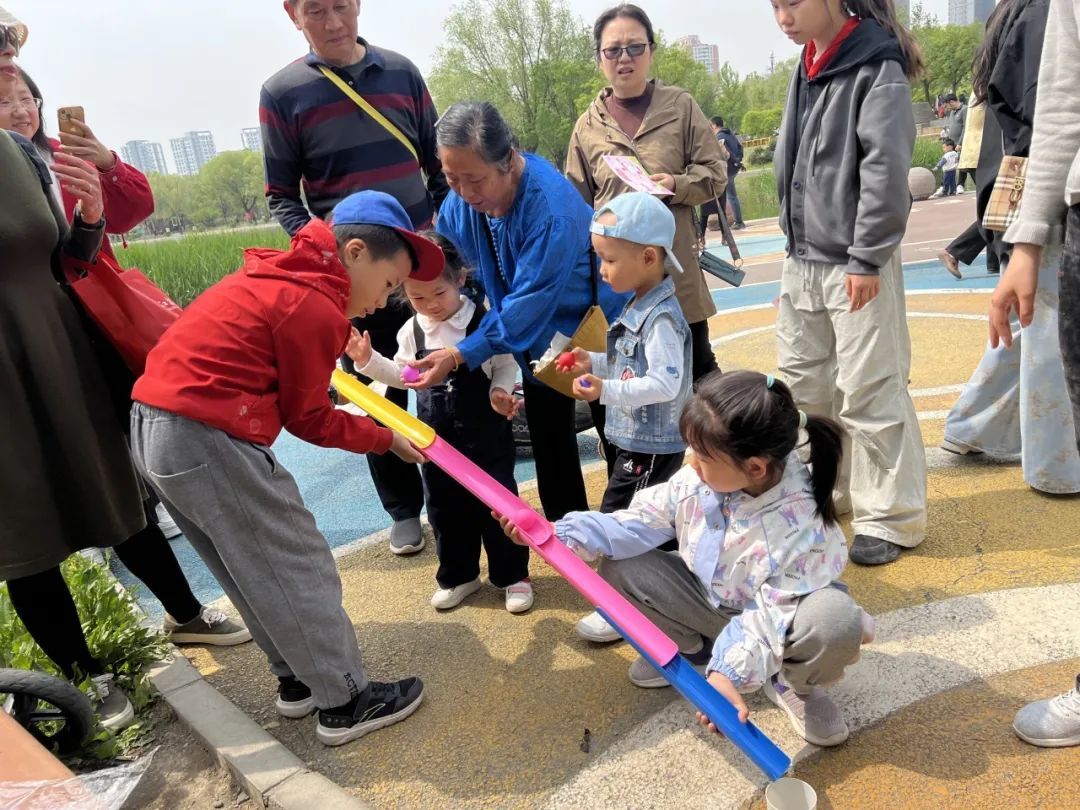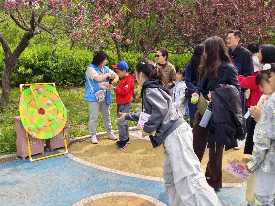 活动开始前,孩子们和家长纷纷与春天“合影”,开启这一场与春天的约会~“沙包丢丢乐”游戏区掀起小高潮,孩子们屏息凝神瞄准飞镖盘,投中黏球时跳跃着和家长击掌庆贺。“珠行万里”环节里,全家接力总动员,用轨道运送小球,每一次成功都增进着亲子间的默契。