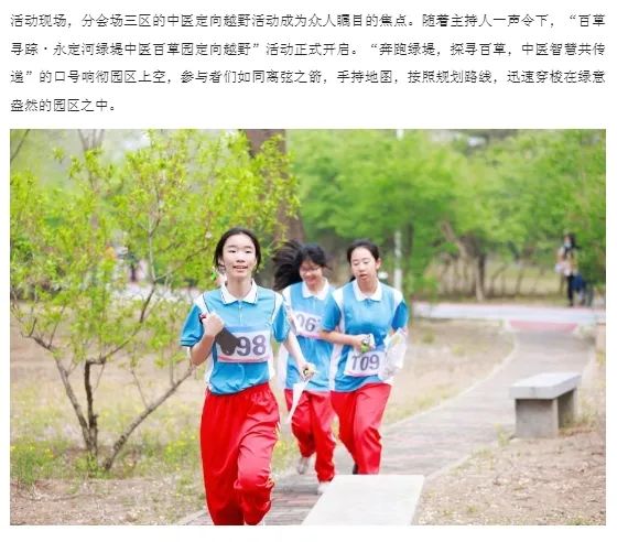 中医定向越野活动将自然探索与团队协作巧妙融为一体,成为引人瞩目的焦点。随着发令声响起,他们手持地图、指南针和计时器冲进绿意盎然的绿堤公园。作为初次参与的 “新手”,他们一头扎进宛如迷宫的林间小径,在草木掩映间急切搜寻打卡旗标。有时会迷失方向,在树林与草地间反复穿梭;有时会觉得体力不支,汗水浸透衣衫,脸颊因为剧烈运动和兴奋涨得通红,想要中途放弃……面对困境,中国人民公安大学、北方工业大学等各大高校学长学姐们伸出援手,鼓励、带动十中学子一起“突出重围”。