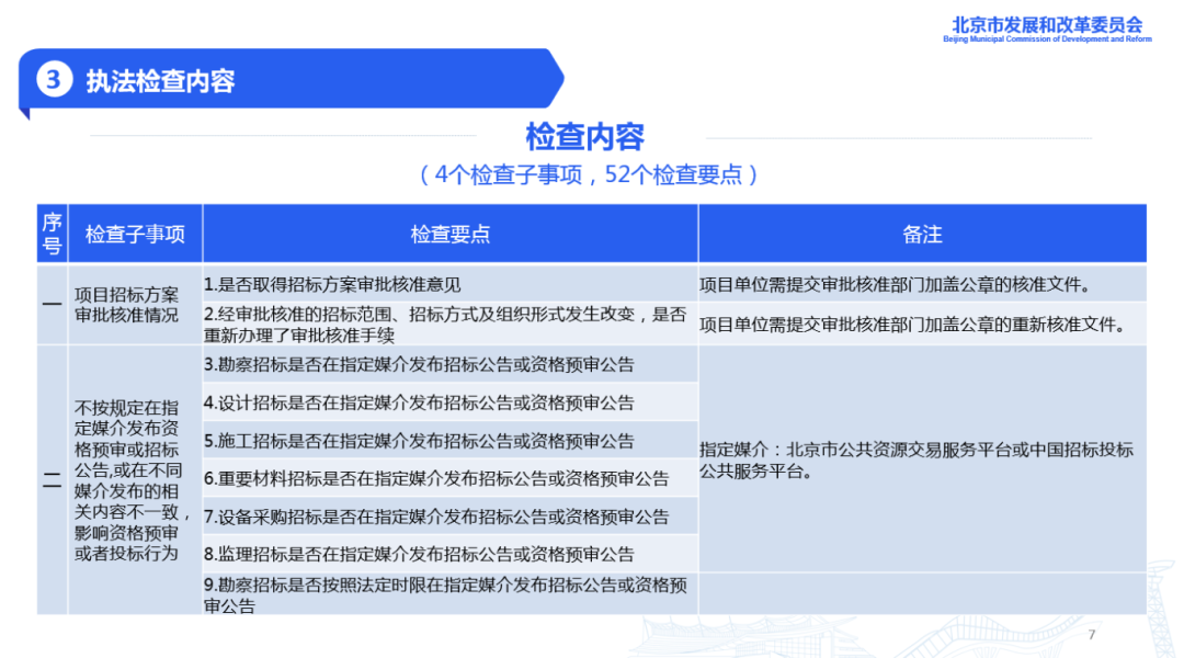 2025年,招投标领域执法的检查对象为2024年市发展改革委核准招标方案的项目,按照50%的比例进行抽查,检查内容包括项目招标方案审批核准情况、依法必须招标项目的招标公告和公示信息发布情况以及依法必须招标项目执行招标制度的情况。