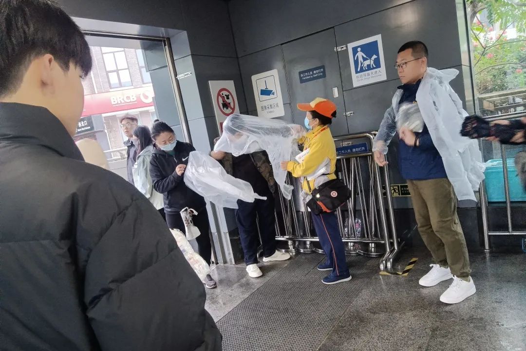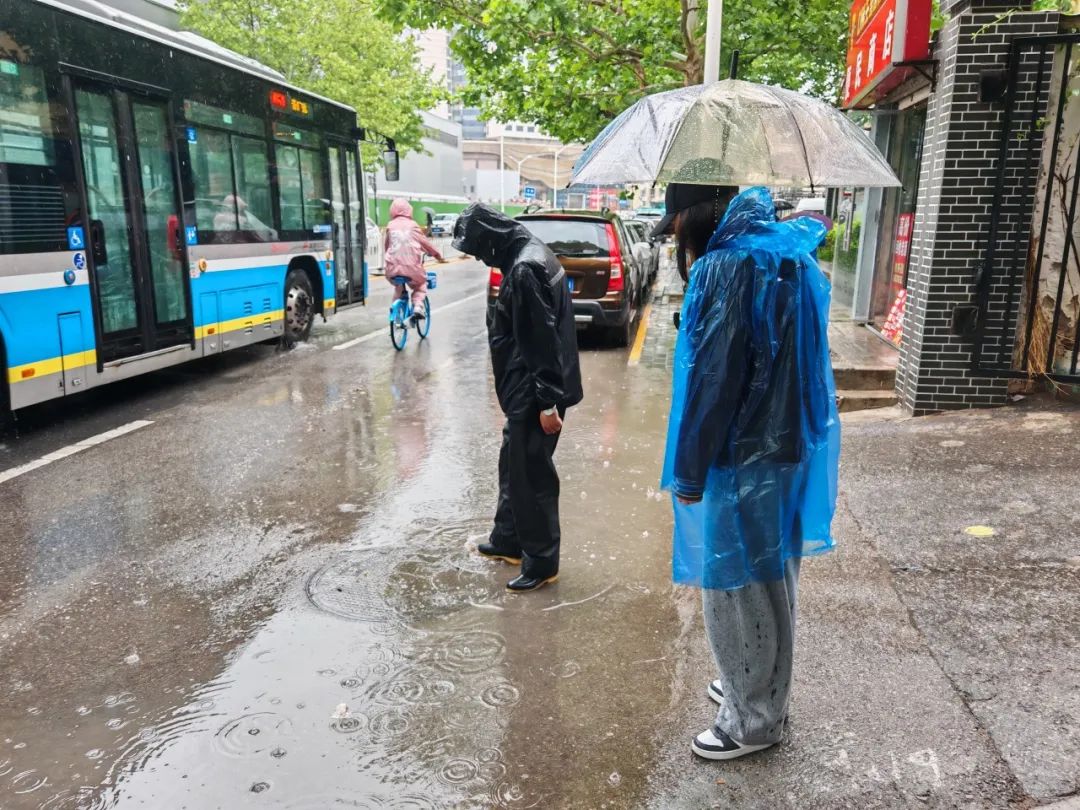 同时,在辖区各公交站口、地铁站出口,身着“柠檬黄”的公共文明引导员,成为大家雨中出行的“指南针”。在持续的降雨中,文明引导员们一边引导车辆、路人有序通行,并及时主动清理公交站点积水,用行动诠释责任与担当,传递文明正能量。