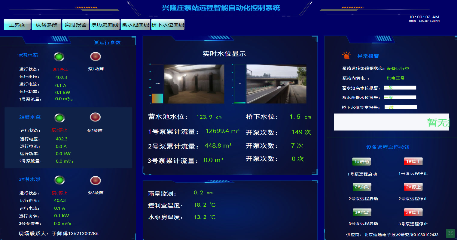 兴隆庄泵站位于大兴区通武线,由北京路桥瑞通养护中心有限公司第六工程处负责进行科技改造。以往,泵站运行依赖人工巡检与操作,存在响应速度慢、人力成本高的问题,尤其在极端天气下,人工巡检不仅效率受限,工作人员还面临安全风险。如今,无人值守泵站的自动化控制系统就像一位“智能管家”,能自动识别泵站蓄水池水位、桥下水位,24 小时不间断监测。一旦水位异常,系统立即启动报警机制,同时远程操作水泵自动启停,快速排水,避免道路积水影响市民出行与生活。