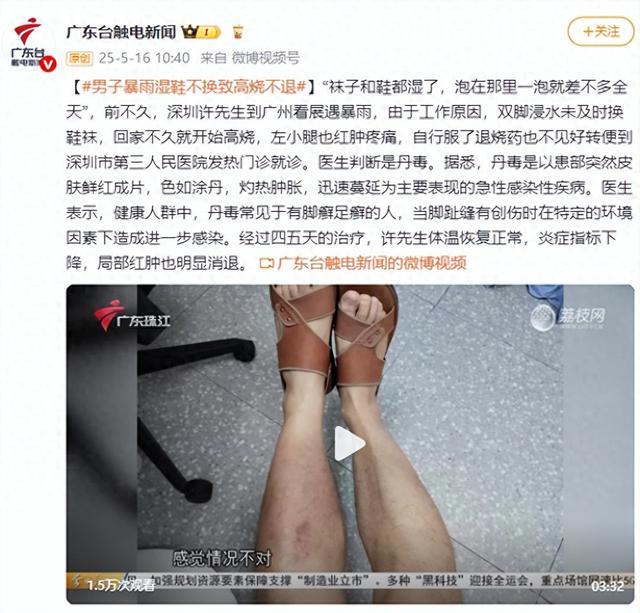 “袜子和鞋都湿了,泡在那里一泡就差不多全天”,前不久,深圳许先生到广州看展遇暴雨,由于工作原因,双脚浸水未及时换鞋袜,回家不久就开始高烧,左小腿也红肿疼痛,自行服了退烧药也不见好转便到深圳市第三人民医院发热门诊就诊。医生判断是丹毒。据悉,丹毒是以患部突然皮肤鲜红成片,色如涂丹,灼热肿胀,迅速蔓延为主要表现的急性感染性疾病。医生表示,健康人群中,丹毒常见于有脚癣足癣的人,当脚趾缝有创伤时在特定的环境因素下造成进一步感染。经过四五天的治疗,许先生体温恢复正常,炎症指标下降,局部红肿也明显消退。