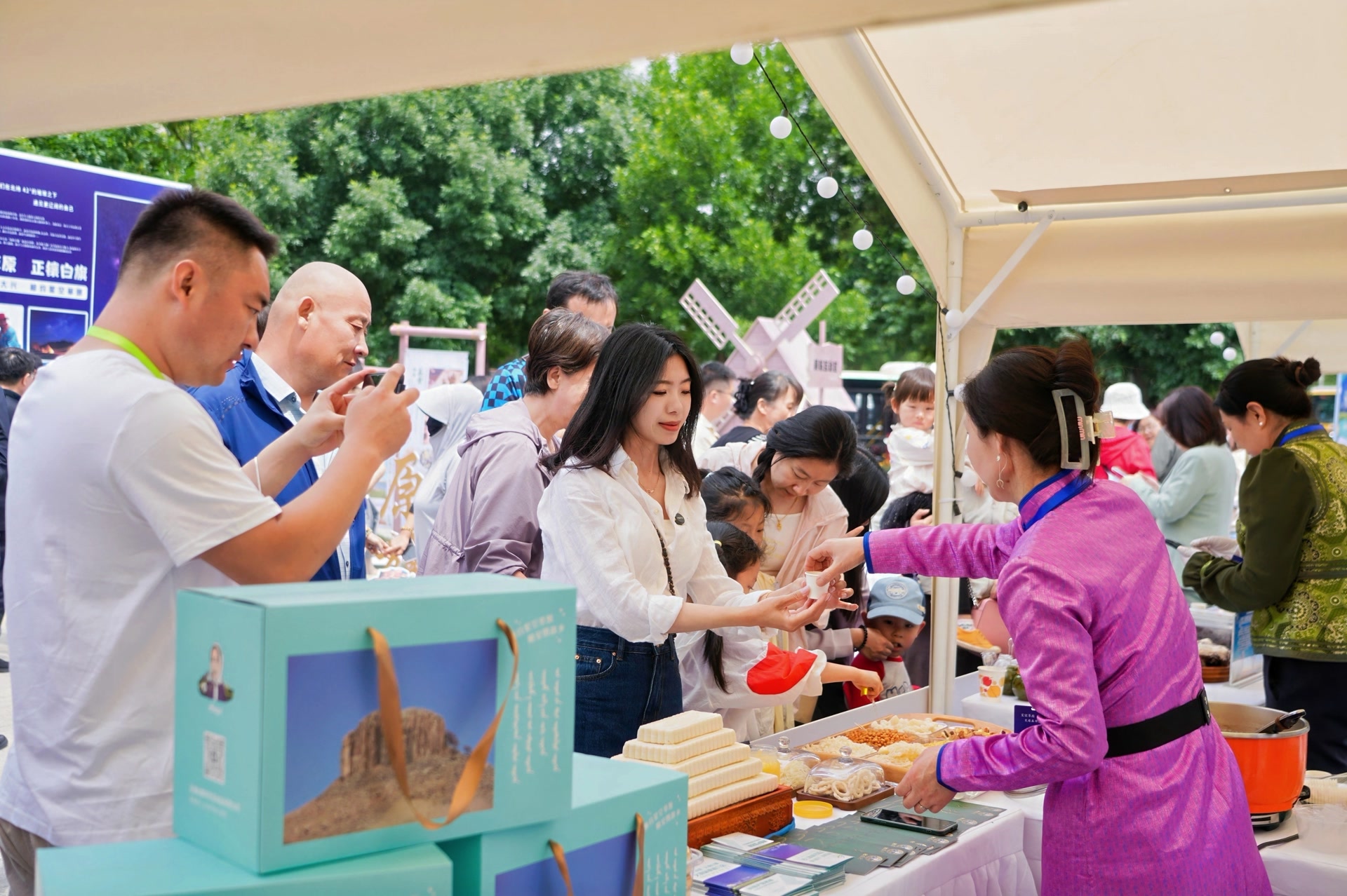 此外,当天会场还展示了正镶白旗的非遗产品、文创产品、察哈尔民族服饰,以及内蒙古奶茶、察哈尔羊肉、奶制品、糕点等特色美食产品。而独具内蒙古特色的歌舞表演也让到场观众感受到了来自草原的热情。