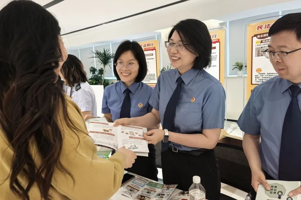 5月15日,海淀区检察院检察官参加在中关村举办的“民法典宣传月”暨“送法进企业‘典’亮中关村”主题普法活动。图为检察官在现场服务点向群众赠阅介绍民事支持起诉等民事检察职能的普法宣传手册,提升大家用民法典解决实际问题的意识和能力。