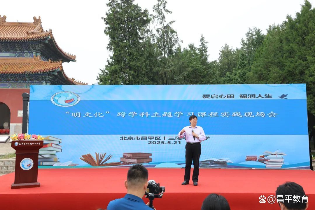 十三陵管理中心昭陵管理处党支部书记巩建忠讲话。他表示,合作资源单位对学校课程建设会全力支持与帮助,为学校深入挖掘地域资源,融合跨学科课程奠定坚实基础。
