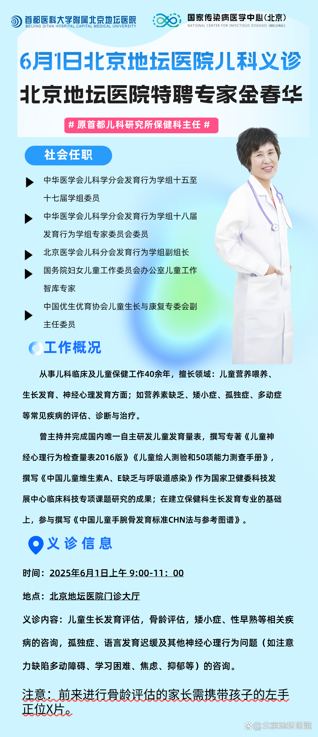 六一儿童节礼物来啦~6月1日北京地坛医院儿科将举办“关爱未来,健康‘童’行”义诊活动。本次义诊由北京地坛医院特聘专家金春华坐镇,旨在服务周边群众,给孩子们提供更好的健康指导。