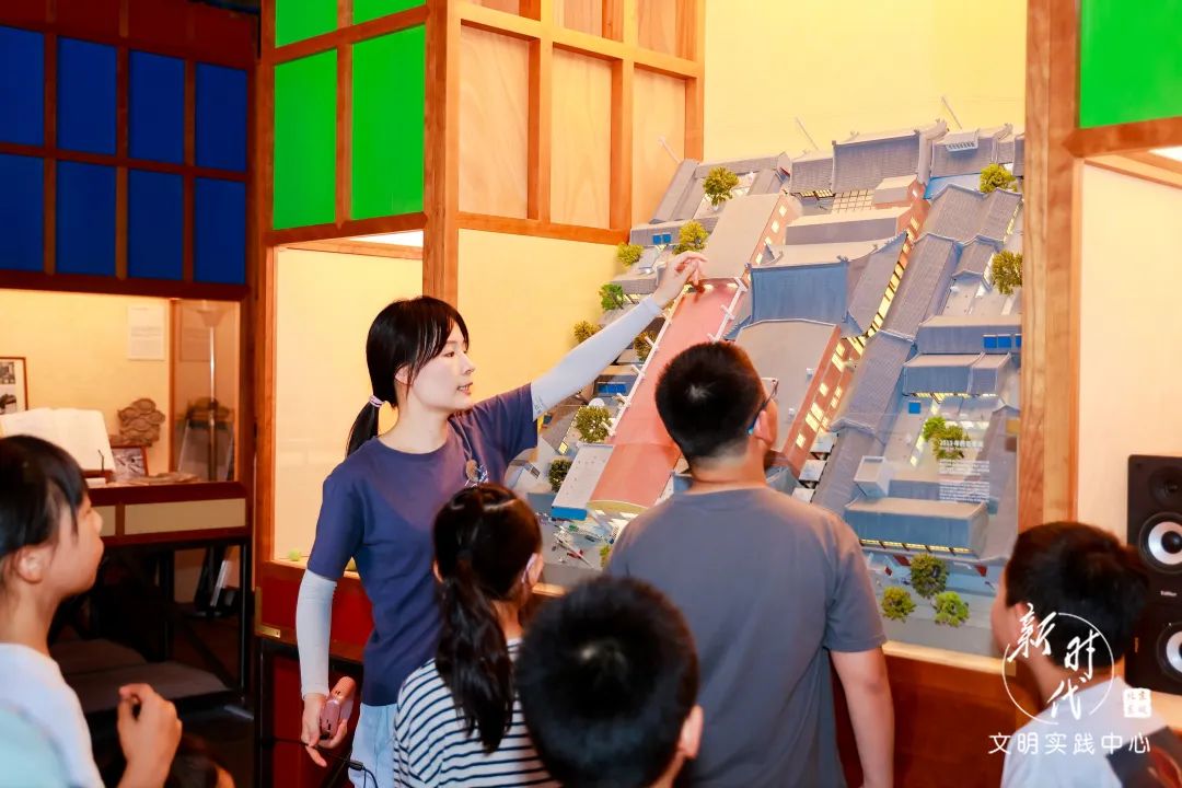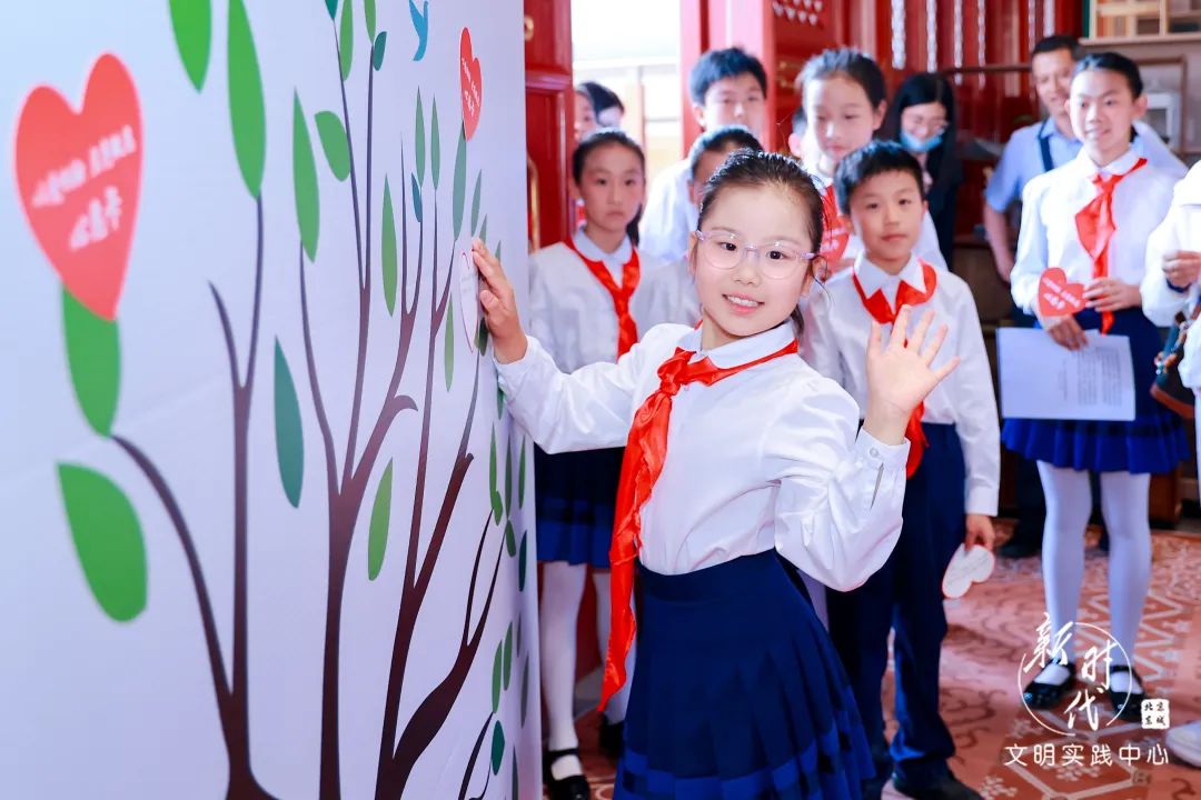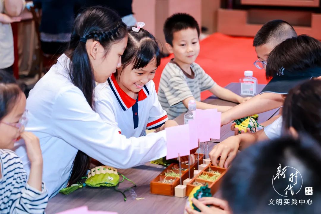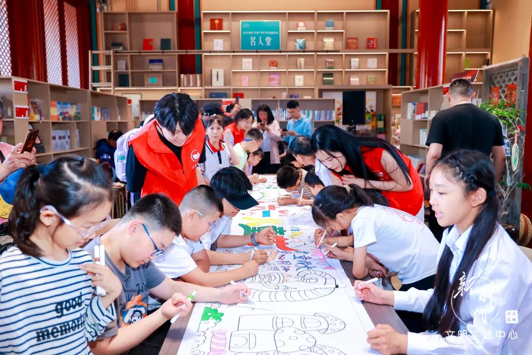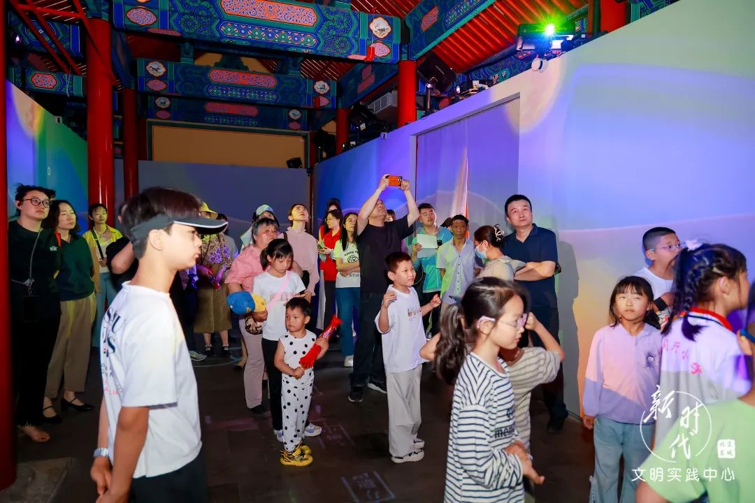 以文明浸润心灵,用体验激发共鸣。东城区始终探索将区位文化优势转化为新时代文明实践的发展优势,不断深化文明实践,通过“科技+文化”“体验+学习”的创新文明实践形式,激发儿童成长动能,让少年儿童在玩乐中亲近传统、在探索中树立文化自信。活动当天,在观中·中轴线在地文化博物馆,学生代表们开启了一场沉浸式体验之旅。在“山门来吧”数字艺术馆、中轴线主题邮局、主题文创店等特色场馆中,大家穿梭于现代光影艺术与历史文化元素之间,感受着传统与现代碰撞交融的独特魅力,仿佛一场跨越时空的文明对话,激发起孩子们对文化传承的深度思考与探索热情。工作人员为孩子们讲解中轴线建筑的历史故事,并通过趣味问答加深记忆,不少同学用稚嫩的笔触记录下对传统文化的理解与热爱。