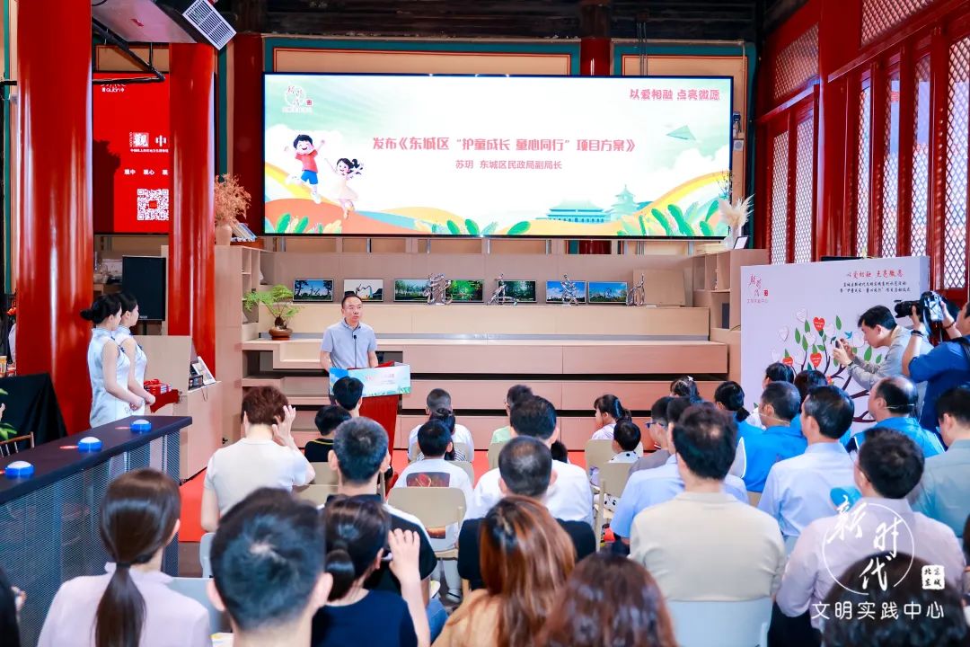 5月27日下午,在“六一”国际儿童节即将到来之际,“以爱相融 点亮微愿”——东城区新时代文明实践系列示范活动暨“护童成长 童心同行”项目启动仪式在观中·中轴线在地文化博物馆拉开序幕。活动由东城区委宣传部(区文明办)和区民政局联合主办,安定门街道新时代文明实践所协办。学生代表、全国文明单位、首都文明单位、市级文明实践基地代表、区有关部门相关负责同志、各街道新时代文明实践工作及民政工作相关负责同志、文明实践志愿者代表等齐聚一堂,共同见证这一重要时刻。