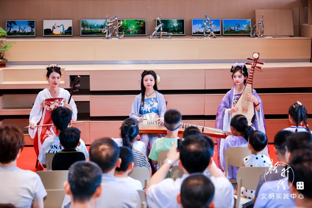 活动中,演奏者们怀抱古筝、琵琶等乐器,指尖轻舞,琴弦震颤,一曲《韶光雅韵》在古筝与琵琶的配合下婉转流淌,旋律轻盈流畅,音符在古建的砖石、木梁间轻盈穿梭。乐声流转间,一幅悠然惬意的美好生活画卷徐徐铺展,也寄托着对少年儿童灿烂未来的深切期许与美好祝福。