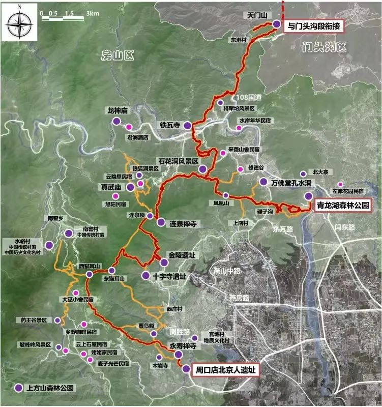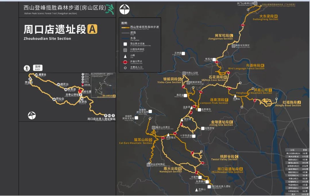 房山是京西徒步的宝藏地带,西山登峰揽胜森林步道(房山区段)是北京浅山千里京华揽胜森林步道的西南起点,更是北京市“京华绿道”的重要组成部分。步道全长约120公里,涵盖13个路段,南起周口店北京人遗址,北至房山区界与门头沟段连接,东至青龙湖森林公园,西至中国历史文化名村、中国传统村落水峪村。周口店遗址段已建成对外开放,金陵遗址段、猫耳山段10月底建成,其余10个路段年底建成。建成后的条条绿道,既能连接一幅幅生态美景,也将串联起房山深厚的文化底蕴。
