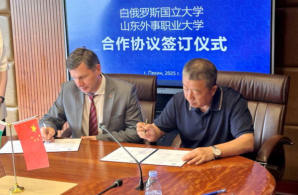 5月30日,山东外事职业大学与白俄罗斯国立大学在北京举行签约仪式,正式签署了合作备忘录(MOU)。这标志着两校在教育、科研及文化领域的深度合作迈入新阶段。此次签约,不仅是两校国际化战略的重要实践成果,更是中白两国深化“一带一路”教育行动、推动人文交流与科技合作的生动体现。
