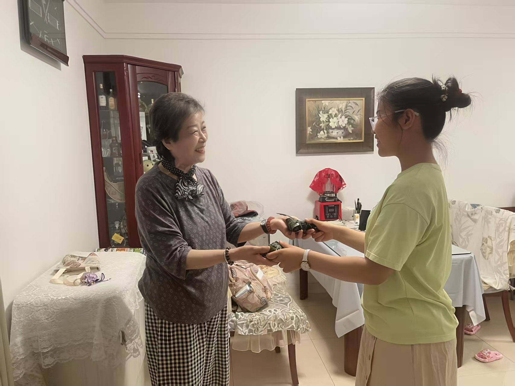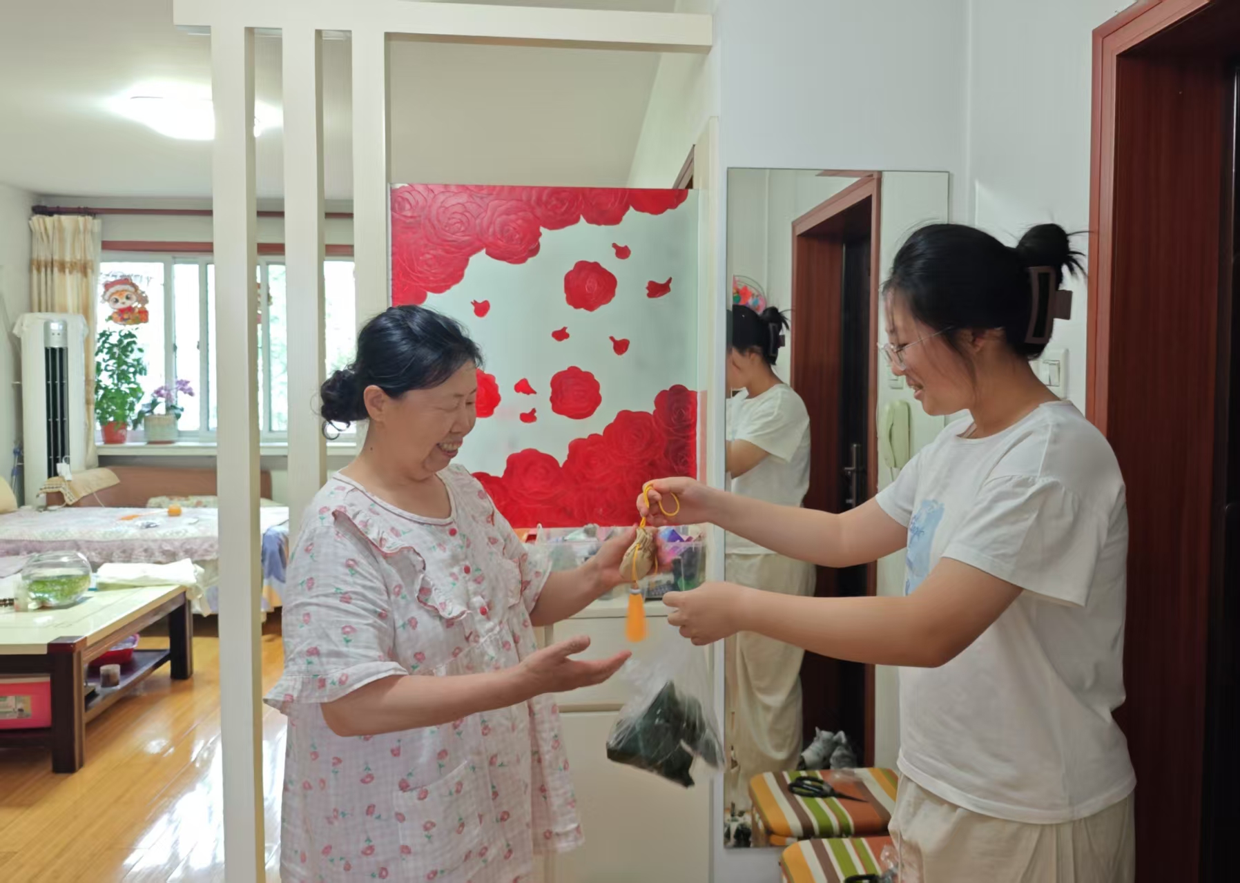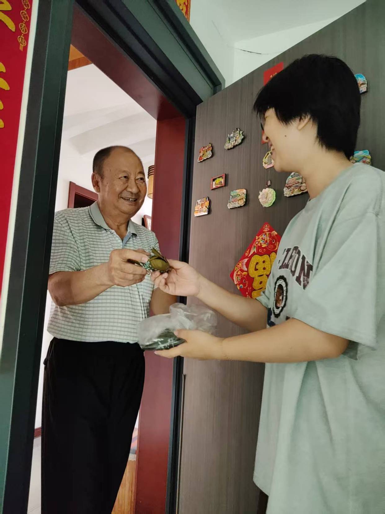 下午,亲子志愿者们带着粽子、挎着布袋分组入户。社区老人张爷爷接过粽子、香囊感动的说:“孩子们亲手做的东西,比买的贵重多了!这粽子一定甜,香囊挂门上,满屋子都是艾草香,心里也暖乎乎的。”王女士感慨:“社区总记挂着我们,端午送粽子,平时有义诊、理发、按摩等服务,住在这儿特别安心。”