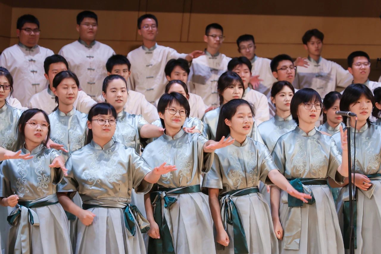音乐会分为古韵新声、韶华逐梦、礼赞和鸣和山海同频四个篇章,选取不同主题的歌曲进行演唱。在“古韵新声——当诗词遇见旋律”篇章,合唱团以现代编曲重新演绎经典诗词。师生将《敕勒歌》《山居秋暝》等经典古诗词名篇融入乐曲中,以饱满的情感唱出对诗词的理解和感悟。在“韶华逐梦——唱给青春的抒情诗”篇章,《童年》《如愿》等歌曲以跳跃的音符、灵动的歌声唤醒师生及嘉宾的美好记忆,表达出师生的理想情怀。此外,“礼赞和鸣——用歌声拥抱世界”和“山海同频——奏响国际乐章”中,《世界赠予我的》《阿里郎》等几首脍炙人口的外文歌曲,展现多元音乐魅力,让现场嘉宾感受来自不同国家的音乐和文化。