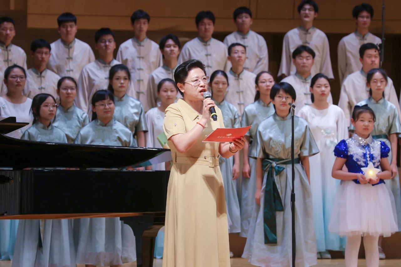 活动特邀的指挥、著名音乐教育家明子琪与合唱团师生共同演绎歌曲《那天一个冲动我加入合唱团》,与学生一起回顾了十年相伴的成长时光。现场还举行了“星芒传递,希望永续”仪式,市区相关领导、集团校校长代表及部分退休校长教师,为合唱团师生送上点亮的星星,将希望与祝福传递。