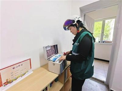 外卖员在暖“新”驿站帮忙整理应急药箱 曙光街道/供图