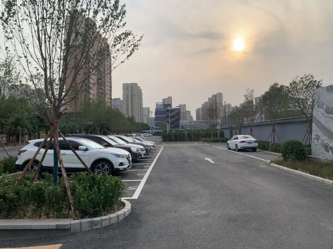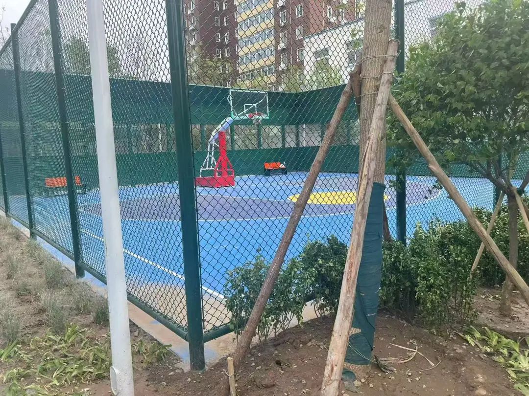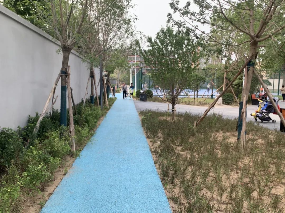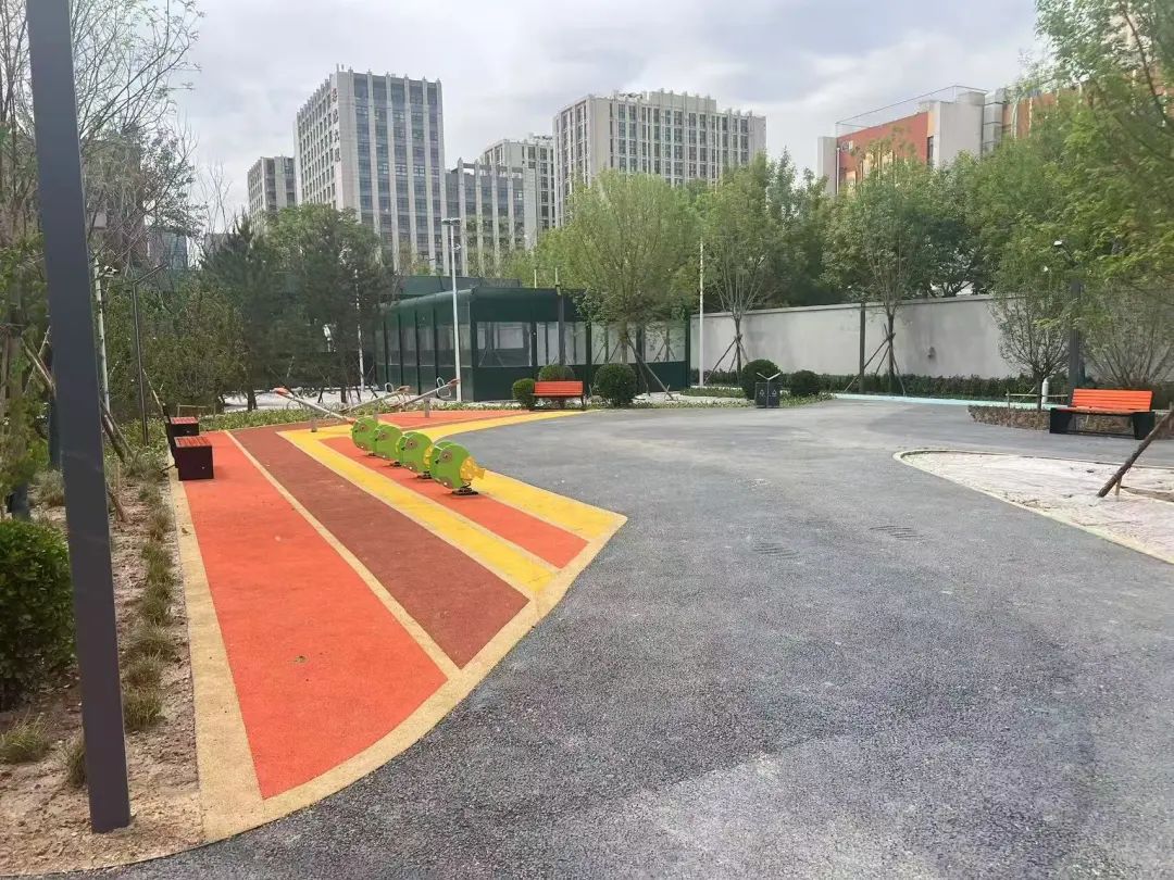 北侧地块打造为“林荫生态停车场”,设置30余个车位,以流苏、楸树等乔木遮荫,搭配绿篱隔离,兼顾实用性与美观性;南侧地块则升级为“体育公园”,包含半场篮球场、匹克球场、乒乓球区、环形跑道及儿童活动区,并通过彩色地面铺装和隔音防护板设计,既激活场地活力,又降低扰民风险。