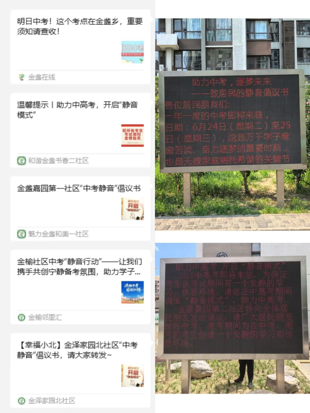 党群工作办公室与各社区(村)依托线上微信公众号,同时通过线下电子屏滚动播放倡议书,发布考试期间出行提示,并引导居民错峰出行、减少噪音。