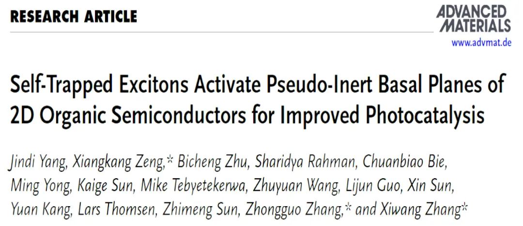 该研究阐明了有机二维光催化剂中"伪惰性基面"的形成机制与调控策略,通过维度调控诱导激子自陷,实现基面动态激活,显著提升催化性能,为高效光催化剂设计提供新的见解,对于应对能源短缺、碳中和及污染物治理等难题具有重要意义。该工作以“Self-trapped excitons activate pseudo-inert basal planes of 2D organic semiconductors for improved photocatalysis”为题发表于材料科学领域顶级期刊Advanced Materials(中国科学院期刊分区1区TOP期刊,影响因子27.4)(图6)。资环所与昆士兰大学联合培养的博士生杨金帝为论文的第一作者,张忠国研究员、张西旺教授和昆士兰大学曾祥康博士为论文共同通讯作者。本工作得到了北京市科学技术研究院创新工程项目资助。