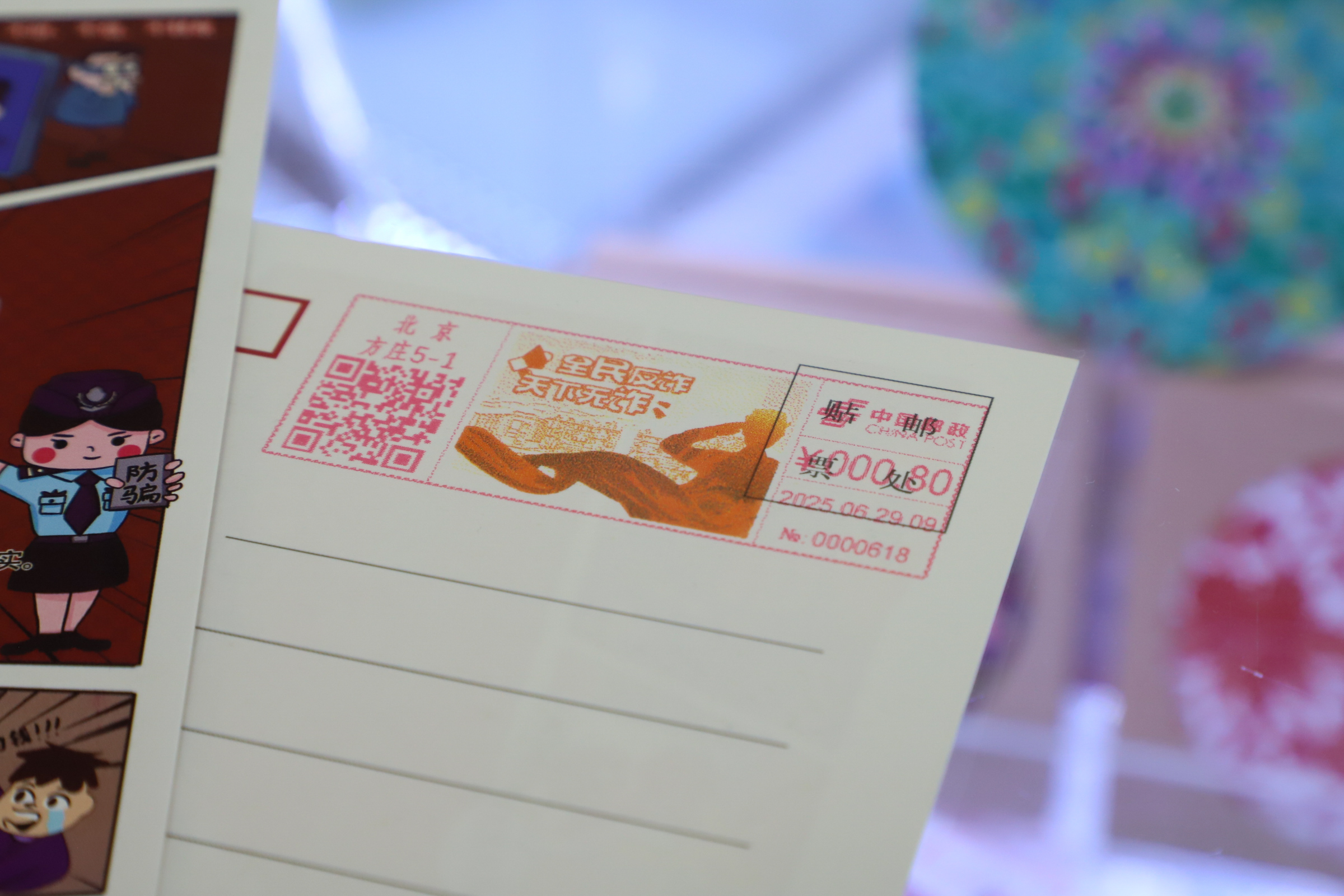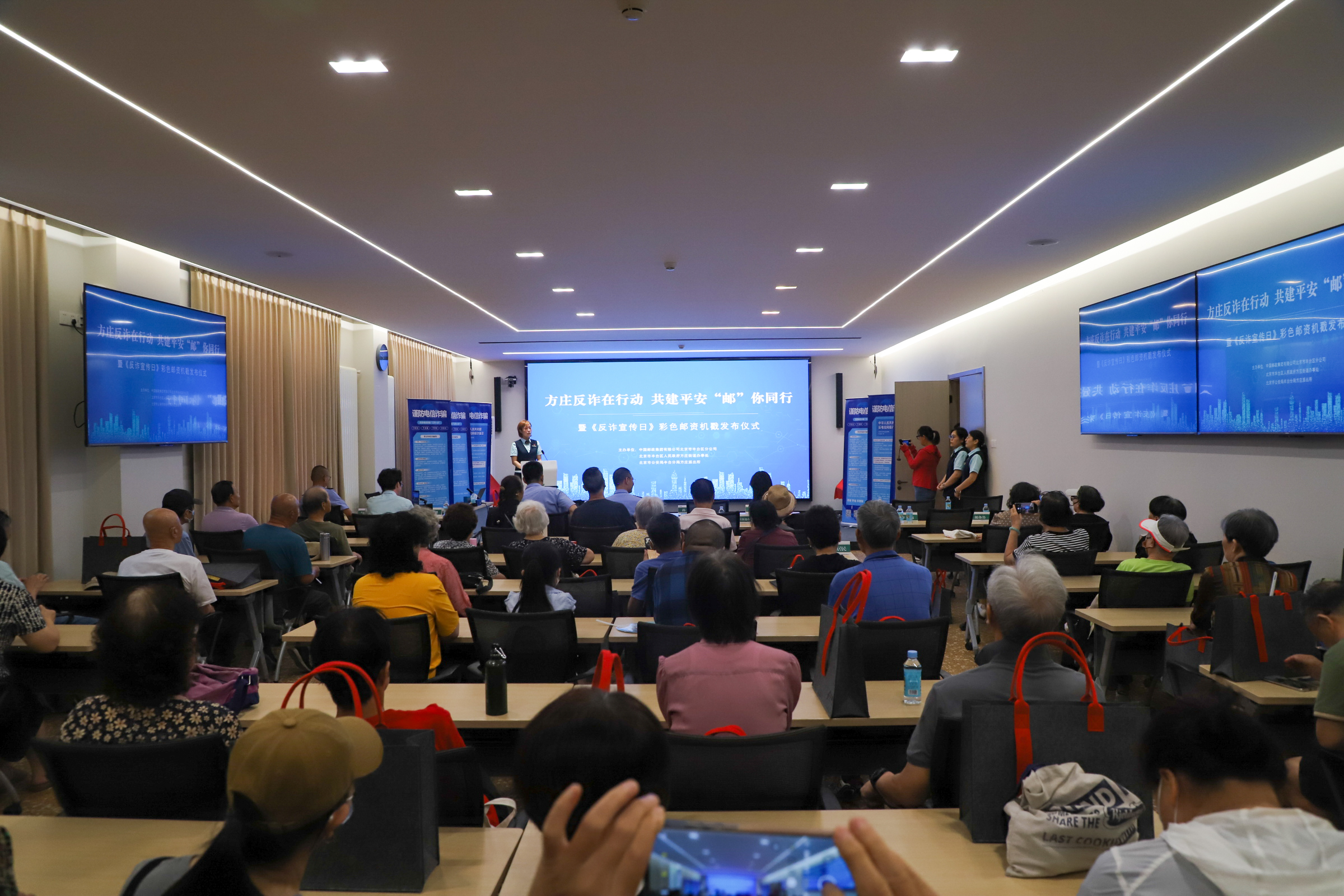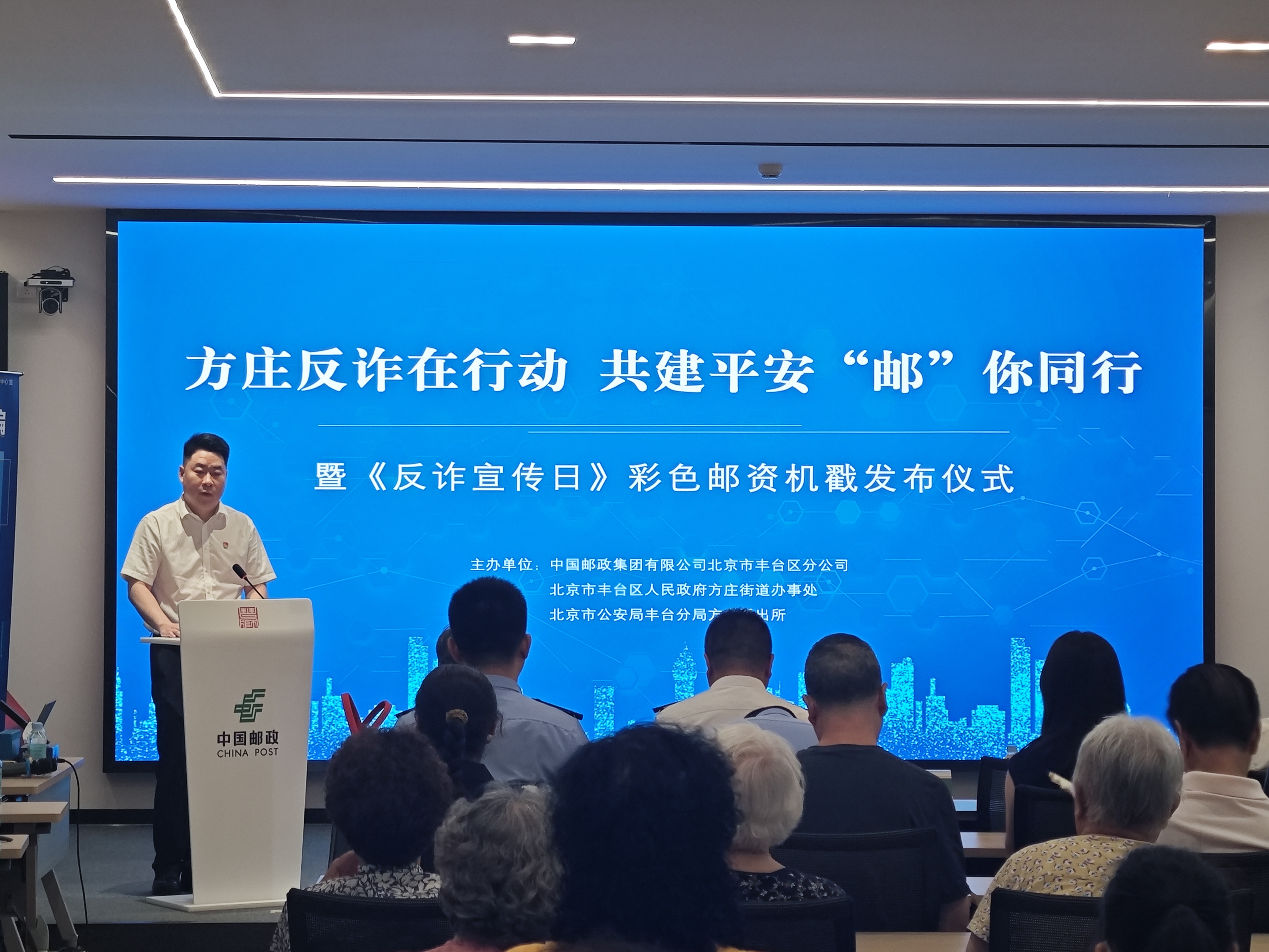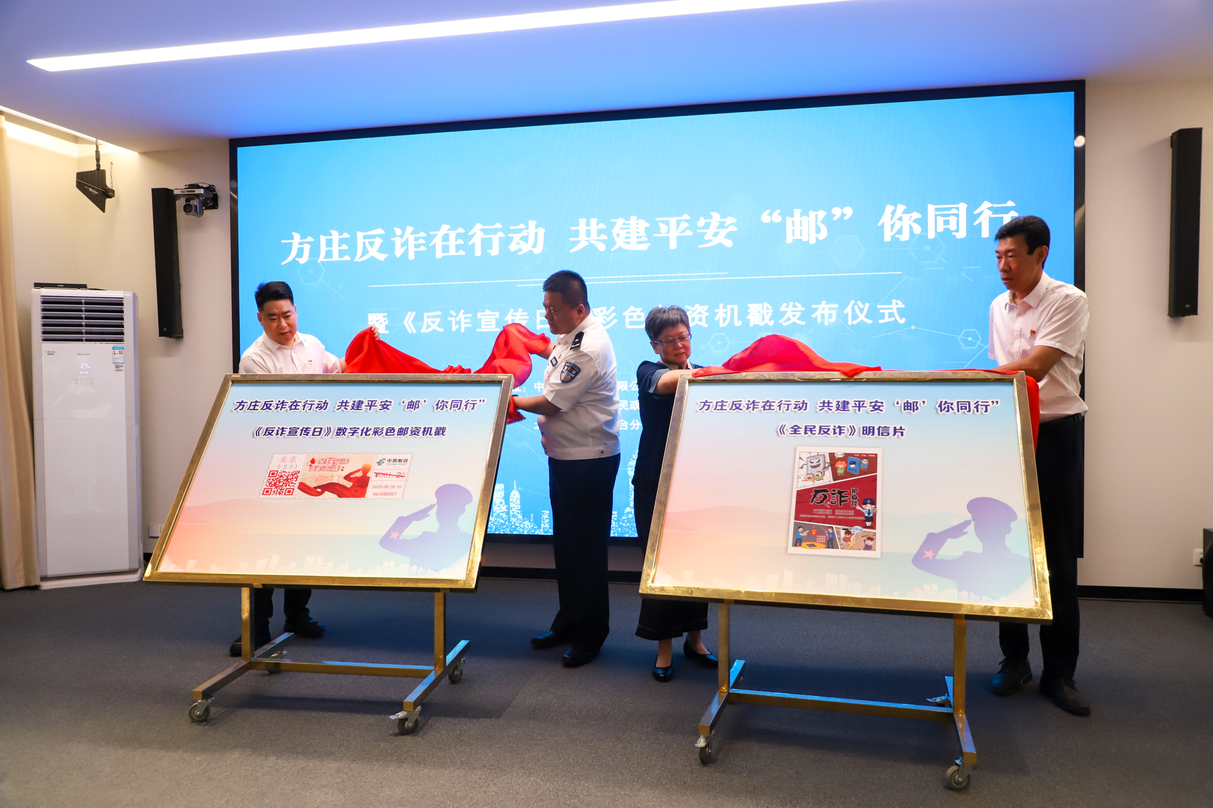 活动现场,气氛热烈。丰台区公安分局、方庄街道办事处、丰台邮政公司及方庄派出所相关领导出席本次活动,共同为反诈主题邮戳及配套明信片揭幕。该邮戳设计巧妙融合朗朗上口的反诈标语与方庄特色地标,明信片背面生动呈现反诈知识漫画与警示案例。这些承载邮政特色的宣传品,既成为集邮爱好者竞相收藏的珍品,更将反诈知识如春风化雨般送入千家万户。