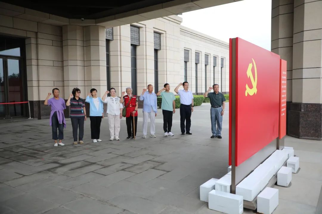 在入党宣誓仪式上,香山革命纪念馆全体党员面向鲜红的党旗,庄严举起右拳,重温入党誓词。