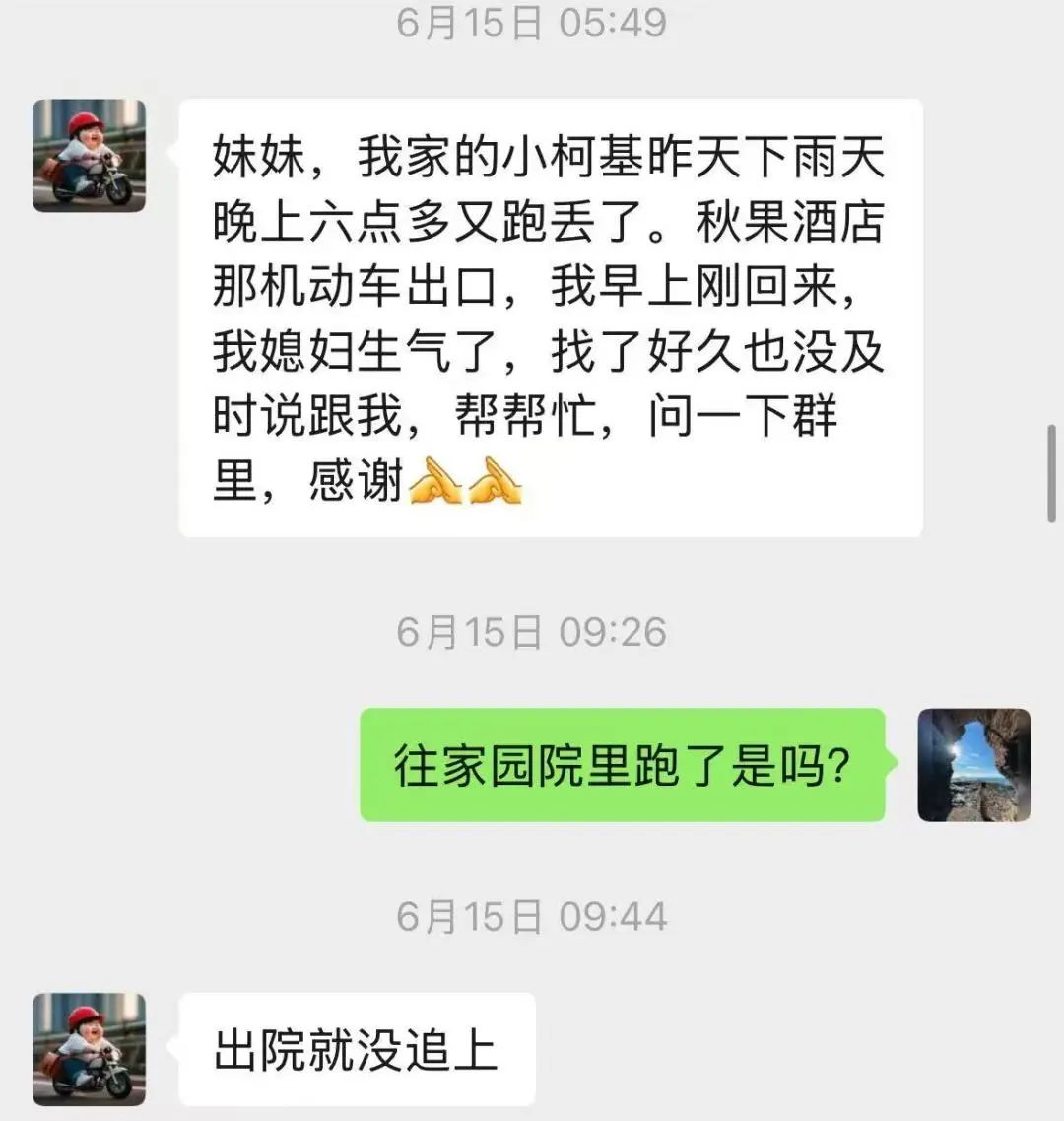 本以为这事告一段落,谁知没过几天,天刚蒙蒙亮,小裴的手机又响了。宋先生的消息带着焦急:“狗又丢了!昨天下雨跑出社区了……”