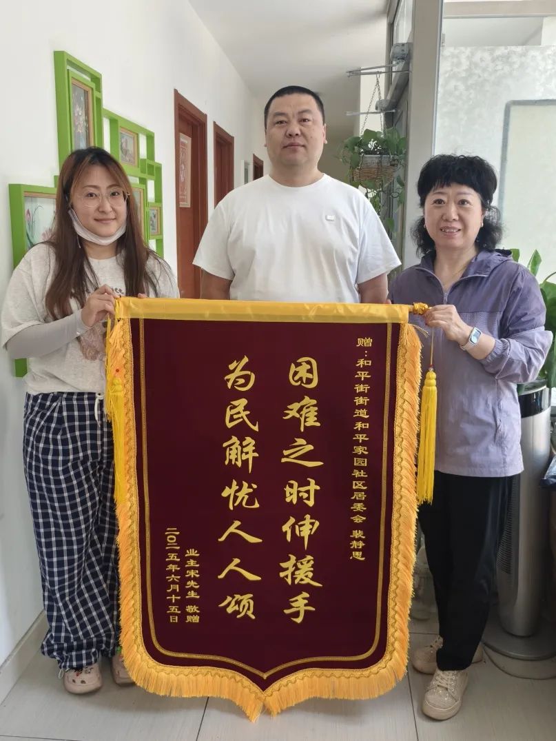 事后,宋先生向冒雨收留爱犬的热心邻居送上水果表达谢意,并第一时间感谢了小裴的带病相助。锦旗上"困难之时伸援手"几个字,映着社区邻里互助的温情。