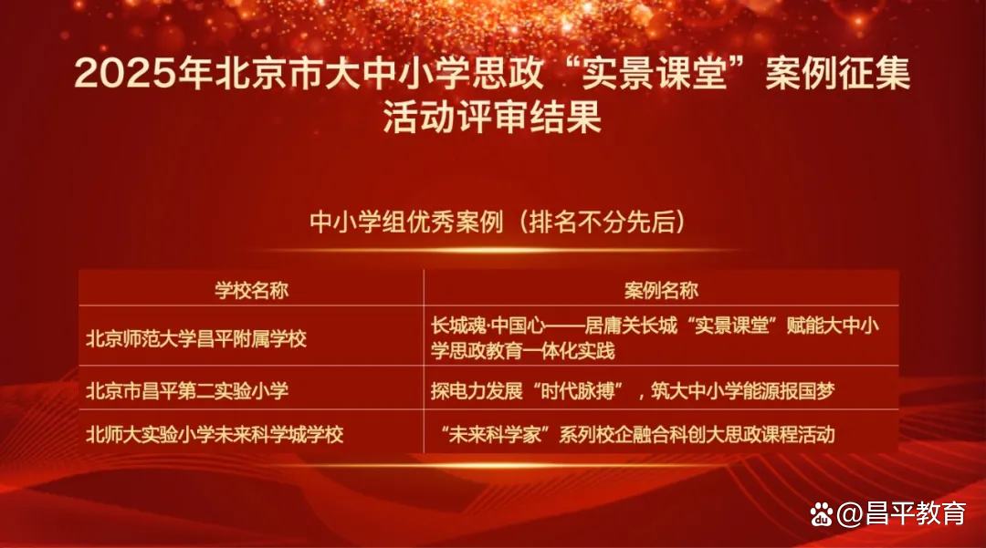 近日,在北京市教委委托北京市学校思想政治工作中心开展的北京市大中小学思政“实景课堂”案例征集活动中,昌平区报送的三个案例获评中小学组优秀案例。继五个研究项目获批北京市大中小学思想政治教育一体化研究项目、三个案例入选2024年北京市思政教育一体化实践案例以来,我区“大思政课”建设工作再获肯定,展现出以实践教学为载体,建好用好“大思政课”实践教学基地的新探索、新突破、新成果。
