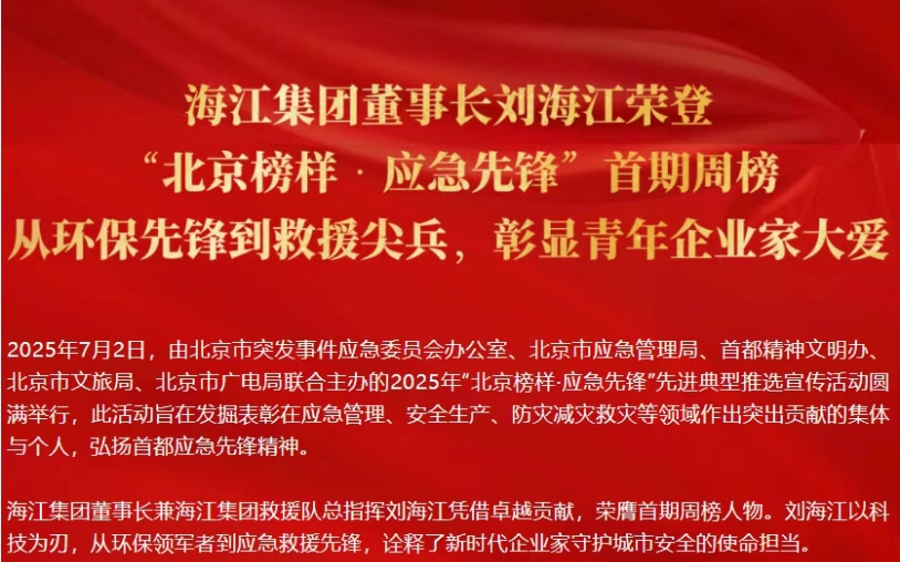 从绿色创新到生命守护,刘海江以科技之光点亮首都应急事业,诠释了新时代企业家的家国情怀与使命担当。