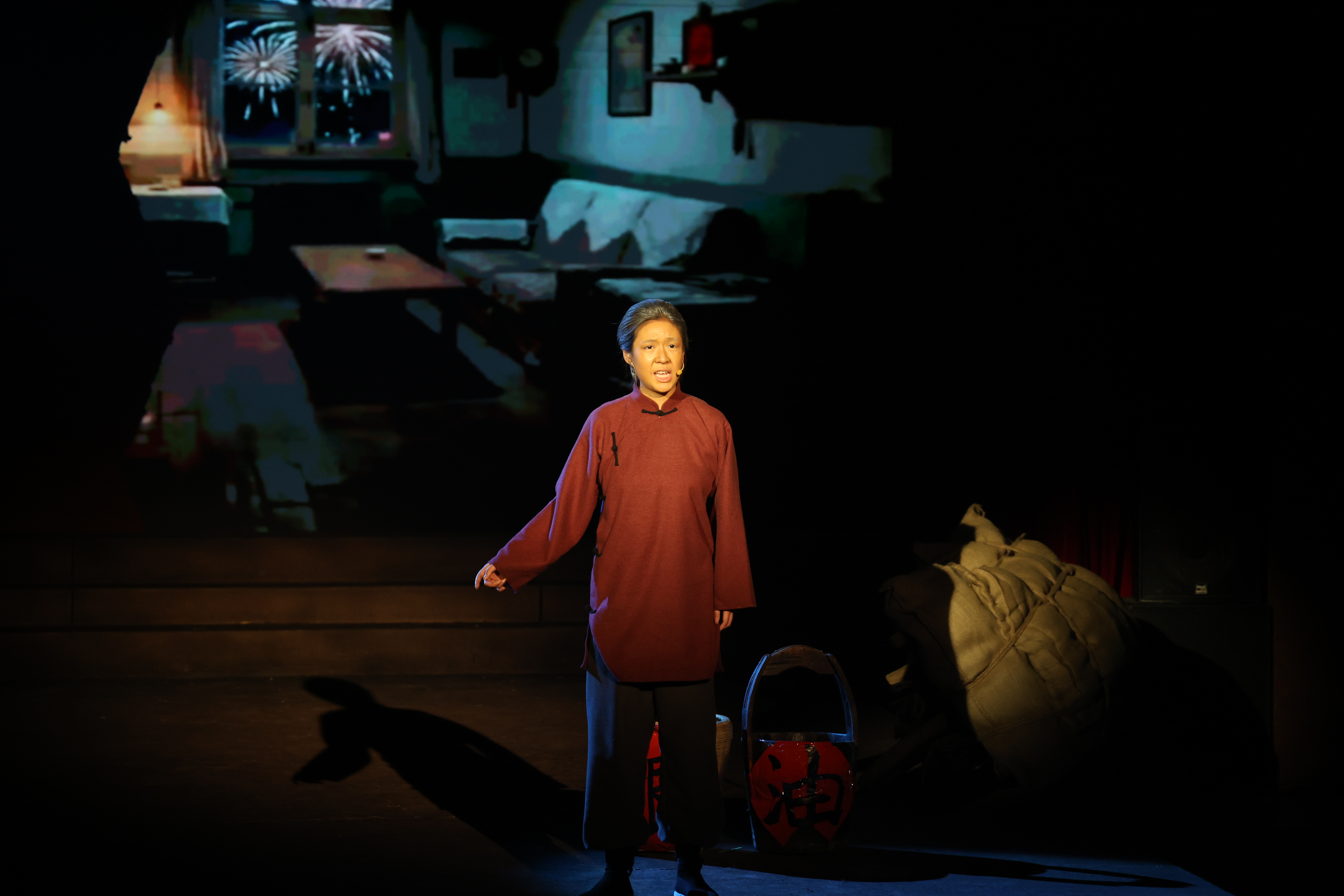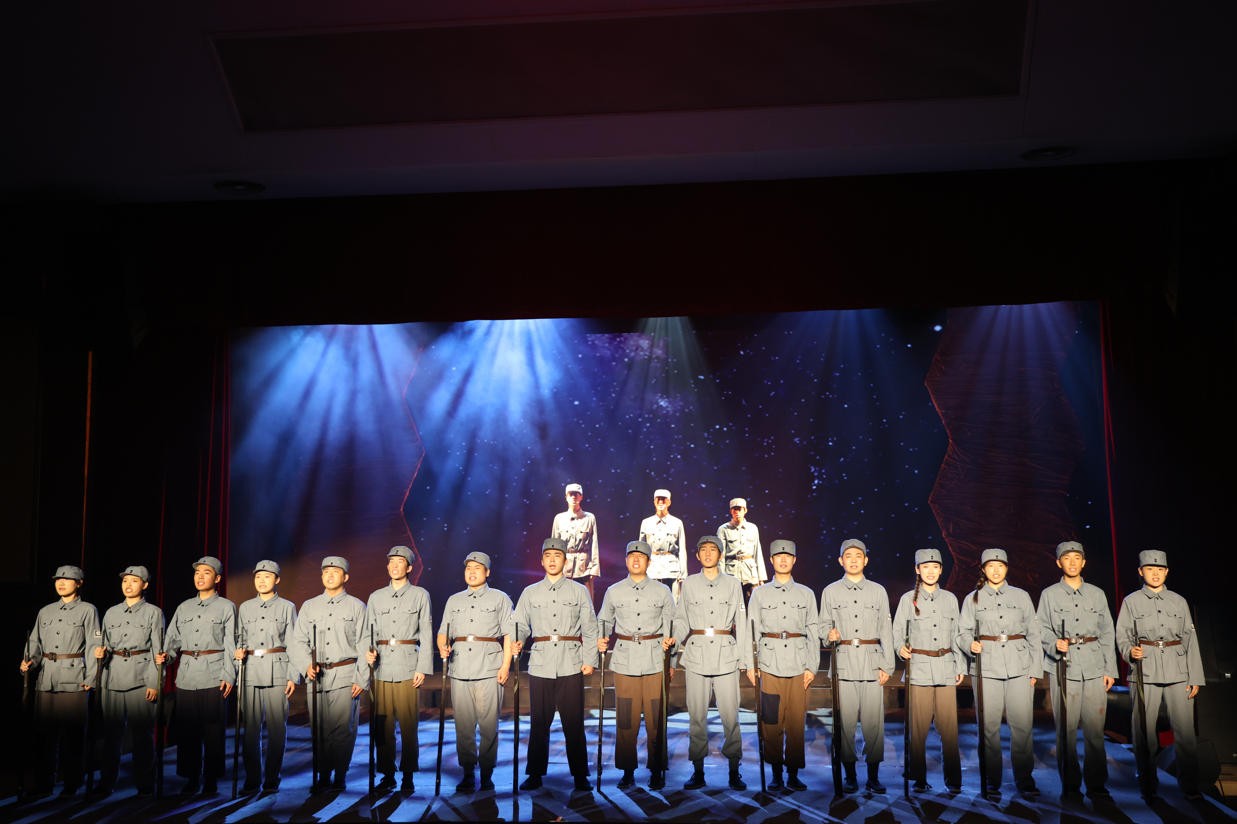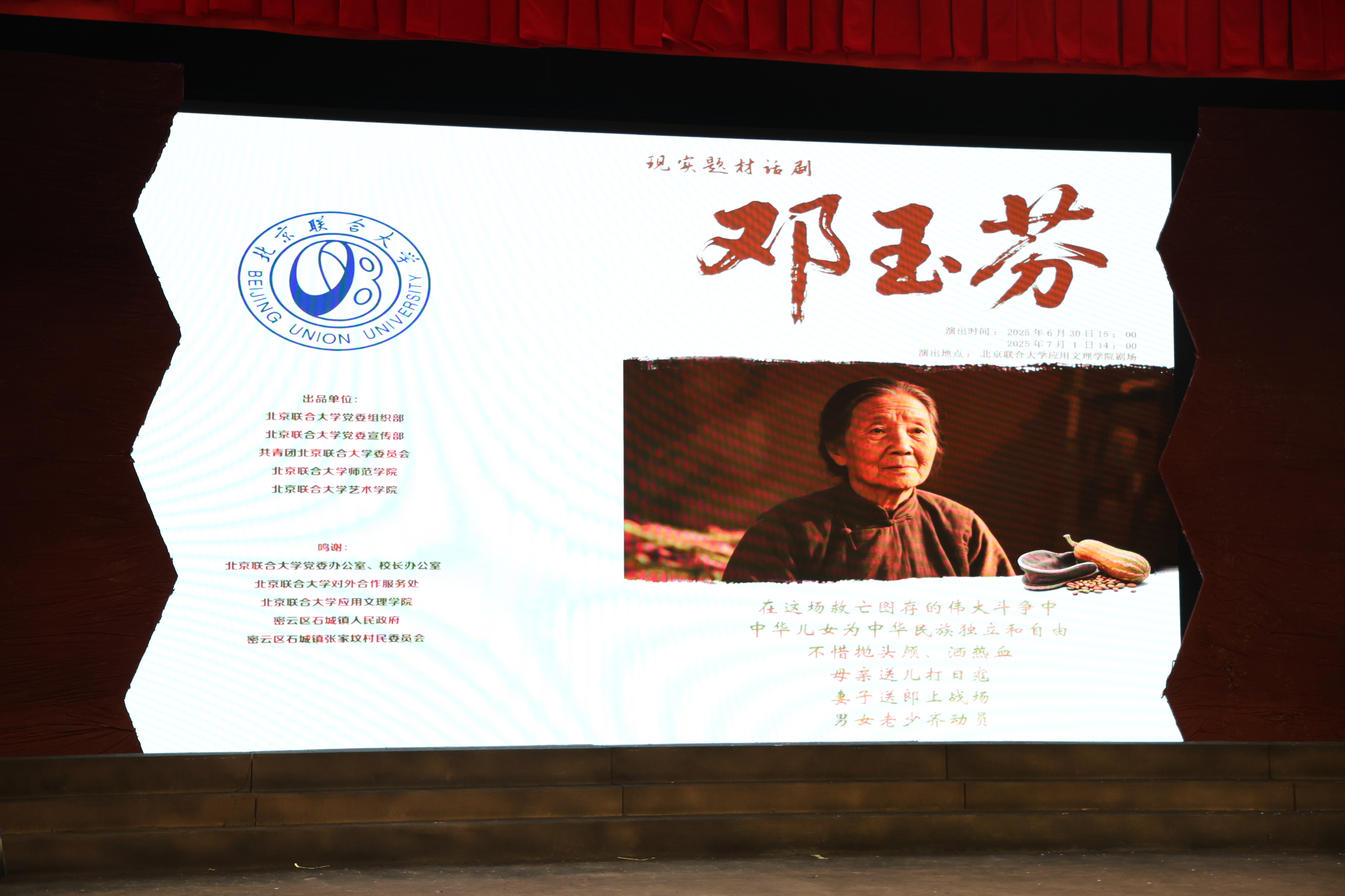 《邓玉芬》是北京联合大学师生精心创排的原创剧目,其以抗战时期“英雄母亲”邓玉芬为原型,生动再现这位平凡母亲在民族危亡之际,毅然送子送夫上战场、毁家纾难的壮烈抉择,以现实主义笔触构建“个体命运—民族抗争—精神传承”的三重叙事维度,通过“迎亲—送子—守盼”的生命段落,将个人苦难升华为中华民族救亡图存的集体记忆。