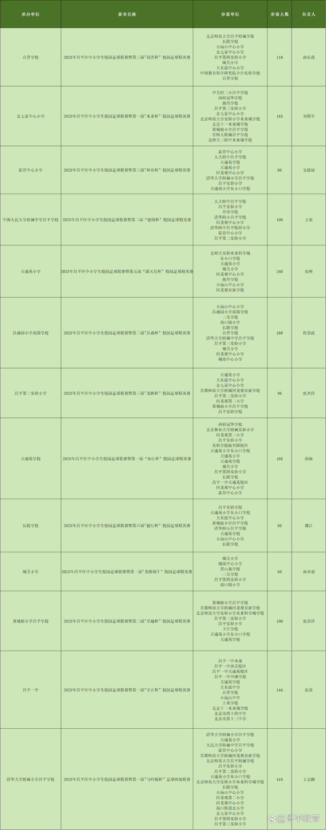 为增强学生体质,丰富学生课余生活,推动校园足球的发展,“相信体育的力量”2025年昌平区校园足球比赛暨第三届“龙腾杯”昌平区青少年足球精英赛在昌平第二实验小学举行,本次比赛由昌平第二实验小学承办,共8个单位、8支队伍参赛。