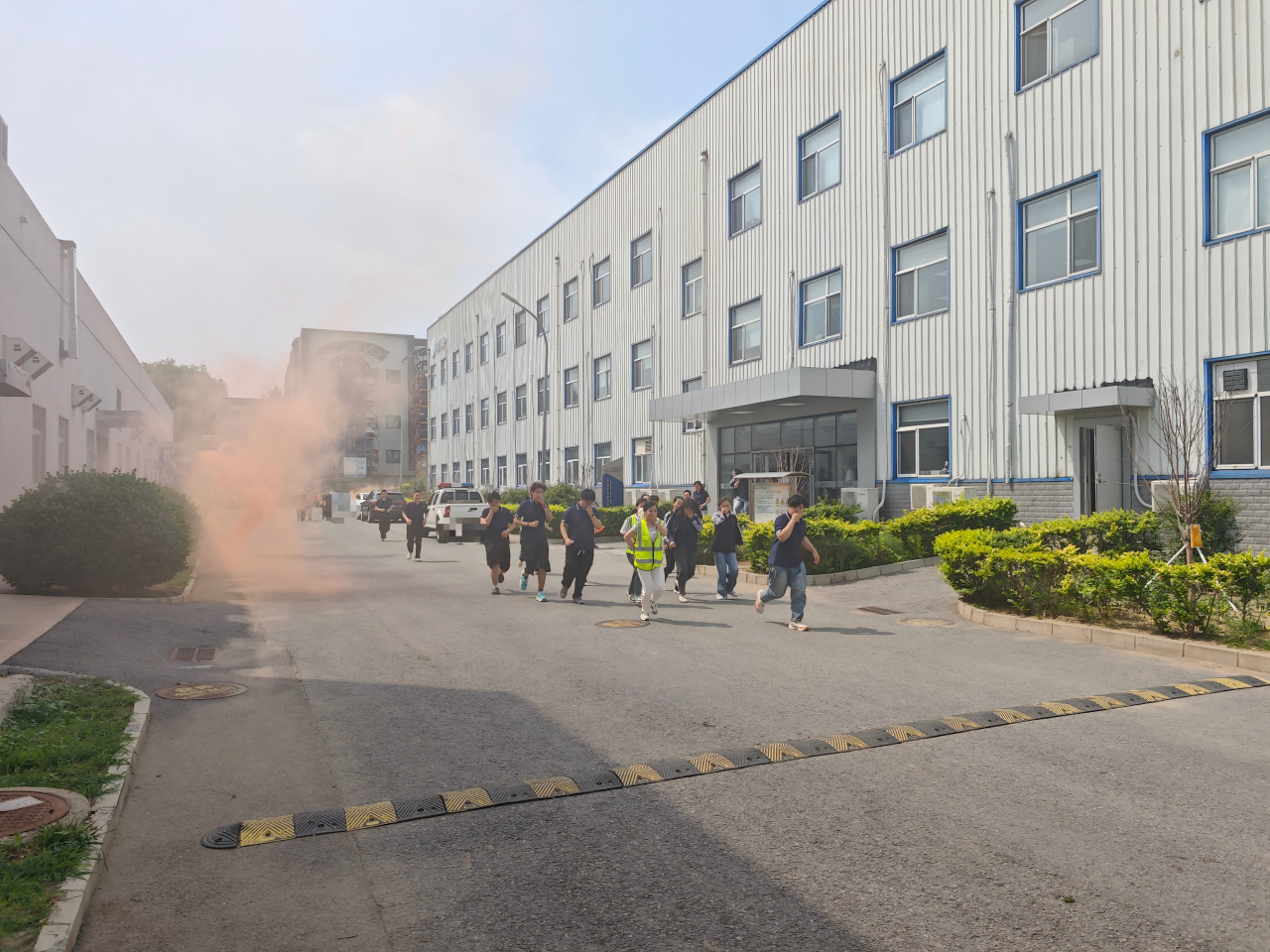 随着模拟火情的出现,厂房内一层热缩机插排引燃周围纸箱,现场人员发现后立即通知班长。班长迅速组织人员利用灭火器控制火势并上报。园区消防控制室接到通知,第一时间确认消防控制主机火警信息,检查消防设备状态,拉响声光警报并切断门禁电源。义务消防队员和微型消防站人员迅速响应,身着战斗服、携带灭火工具赶赴火灾现场,开展专业灭火、抢救重要物资、隔离可燃物、协助人员疏散和警戒等工作。疏散引导组则引导员工快速、有序地撤离厂房,跑向紧急集合点。