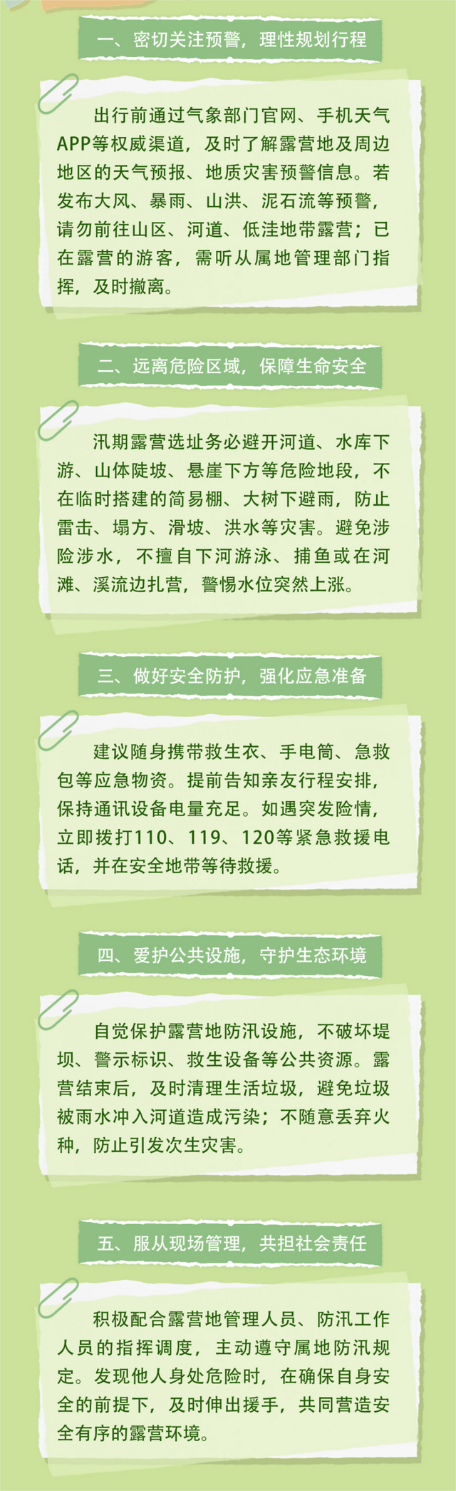 北京市文化和旅游局发布以下《汛期文明露营倡议书》,倡议市民游客增强安全意识,文明露营,共筑汛期安全防线。