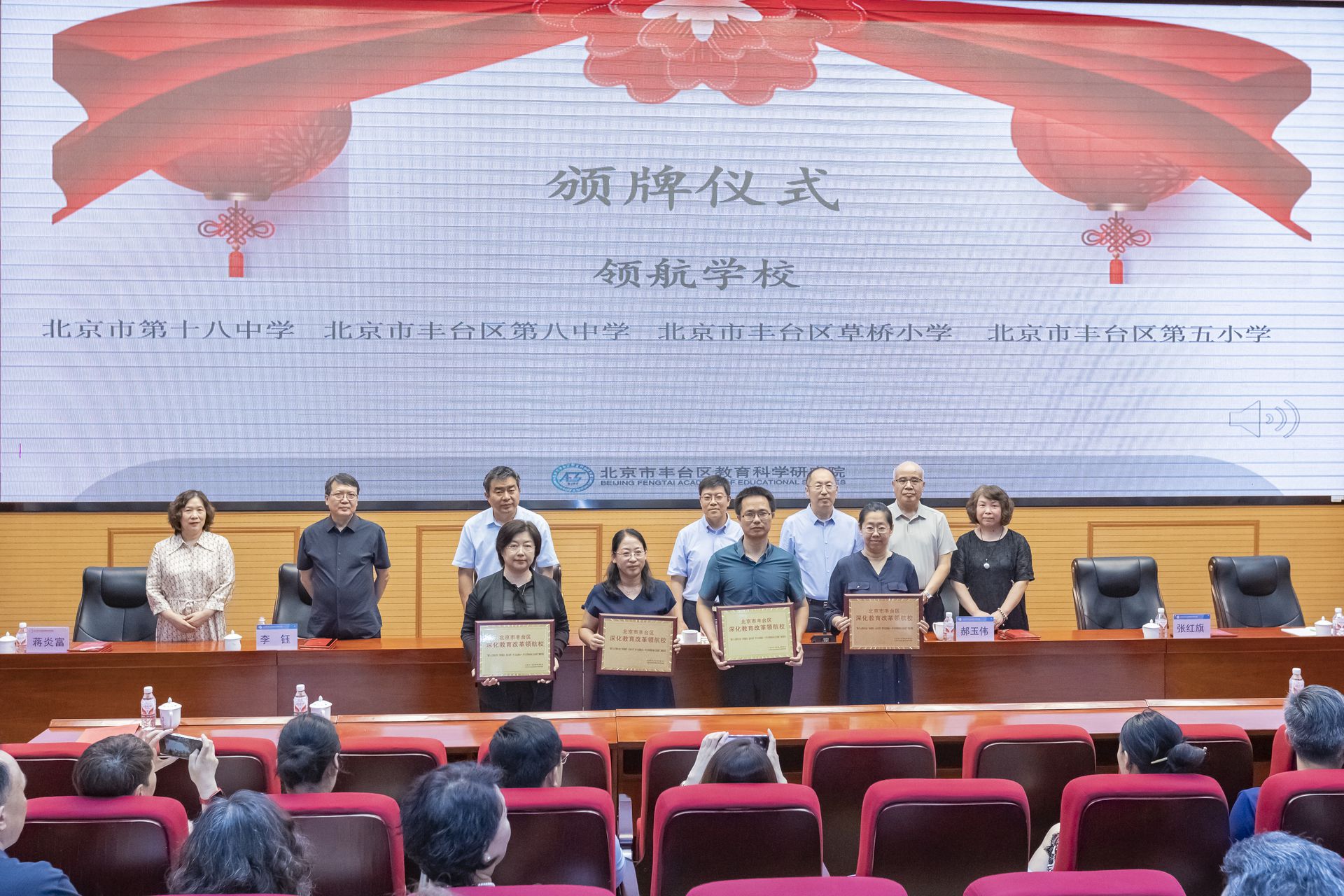 会议现场,北京市第十八中学、丰台区第八中学、丰台区第五小学、丰台区草桥小学4所学校还被授予了“教改项目领航学校”;北京市第十八中学实验学校、北京十二中科丰校区等22所学校获颁“第一批项目实验校”标牌。管杰、李金栋、李宏、李磊、林艳玲、王建婷、李健7位专家受聘为领航专家,93位指导教师及113名“种子教师”获得聘书。项目领航专家林艳玲校长公布了教改项目的下半年计划,将围绕形成共识、课堂转型、学习公平、校际共同体、生态系统五大目标,通过观察反思、调查反馈、团队互动学习等路径深化教师共同体建设,以研讨课替代评优课,让合作共赢成为校园文化主流。