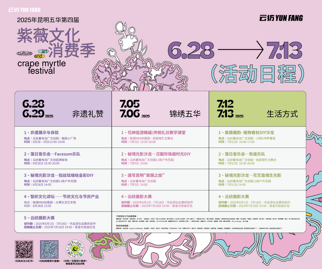 本次活动由中共五华区委宣传部统筹指导,五华区文化和旅游局、丰宁街道办事处等单位联合主办。诚邀广大市民共赴“紫薇绽放·文脉共生”之约,在非遗体验、国风雅集、集章互动中感受传承、激活消费,见证文旅融合生机,共绘“花开五华”的精彩篇章。