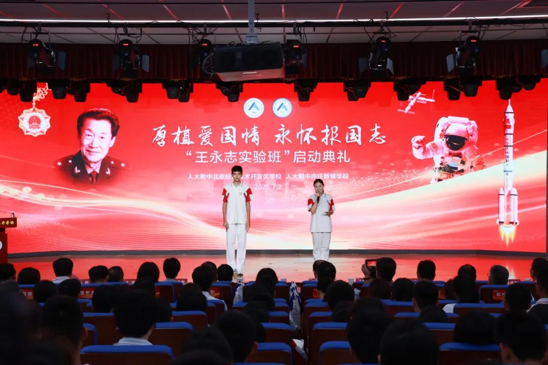 近日,全国首个承载着王永志院士航天魂的“王永志实验班”在人大附中北京经济技术开发区学校(以下简称“人大附中经开学校”)落地,这不仅是载人航天精神的传承盛典,更是该校拔尖创新人才体系培养的又一关键落子。中国工程院院士、“共和国勋章”获得者王永志妻子王丹阳,其女王彤彤、女婿苏彤,以及清华大学、中国科学院、中国航天研究院等多方专家、教育界代表出席活动,与该校初三年级师生代表共同见证这一时刻。