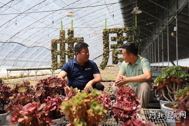 河北本源农业科技有限公司总经理王宇(左)向记者讲述他和多肉的故事。河北经济日报记者 李佳琦 摄