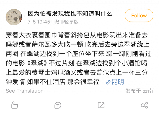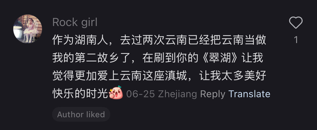 同时有不少游客朋友通过翠湖找到了对于昆明的美好记忆,网友Rock girl说:“作为湖南人,去过两次云南已经把云南当做我的第二故乡了,在刷到你的《翠湖》让我觉得更加爱上云南这座滇城,让我太多美好快乐的时光。” 小红书相关话题下,也有网友晒出翠湖的图片,表示“第一次在电影里看到这么鲜活的昆明”。豆瓣有网友说今年上影节最佳。因为在昆明呆了三年,今年又带家人回昆明旅游,所以看到这个名字就选了这个片子,没想到是这么棒的呈现。也有在美、加等国生活的网友询问电影是否会在美国上映。甚至也有网友将观影纳入了翠湖一日游览的线路当中。有网友写,“ 穿着大衣裹着围巾背着斜挎包从电影院出来准备去吗娜或者萨尔瓦多大吃一顿,吃完后去旁边翠湖绕上两圈,在翠湖边找到一个座位坐下来,聊一聊刚刚看过的电影《翠湖》不过片刻,在翠湖边找到个小酒馆喝上最爱的费琴士鸡尾酒又或者去普蔻点上一杯三分钟爱情,如果不住酒店,那会很幸福。”