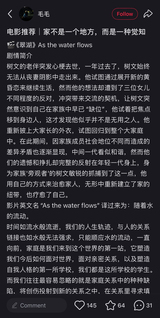 翠湖以昆明翠湖周边的人文故事为背景,尽管影片尚未公开剧情全貌,但展映观众反馈中,“温情”“市井烟火”“时代变迁”成为高频词。豆瓣电影小组中,有不少人称《翠湖》以地域叙事打动观众的作品。有不少网友们都被其中的细节打动对电影给出了高分评价,有网友给出了5分并形容,“很美的叙事,找回了一些看乘船而去的感动,新人导演加一星。”也有网友写,“导演一定非常喜欢翠湖,关于翠湖的每一帧镜头都是浪漫的抒情诗。”也有观众说:“今年拆盲盒拆到的最喜欢的,没有之一。”