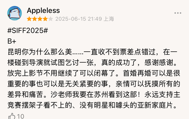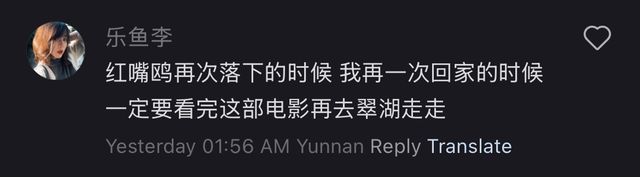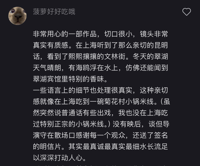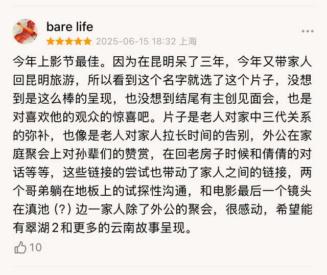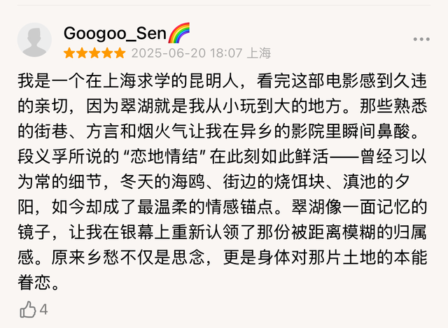 《翠湖》的讨论中“本土团队”“方言电影”等标签尤为突出。近年来,从《一点就到家》到《再见,少年》,云南背景的影视作品逐渐增多,但《翠湖》因更聚焦昆明城市肌理,被看作“本土化叙事的升级尝试”。昆明某影院经理透露,已有观众咨询排片计划:“很多人说,要带着全家去支持。”随着影片上映临近,这股“春城情怀”的热度还将持续蔓延。