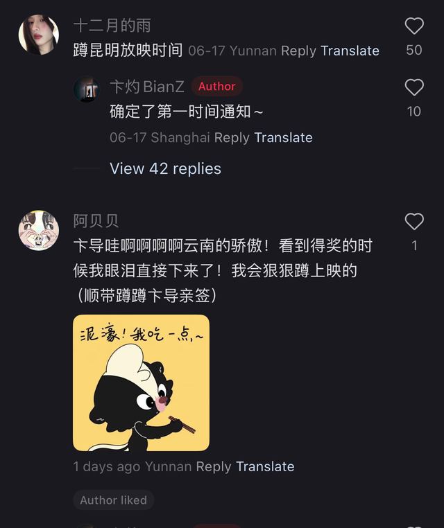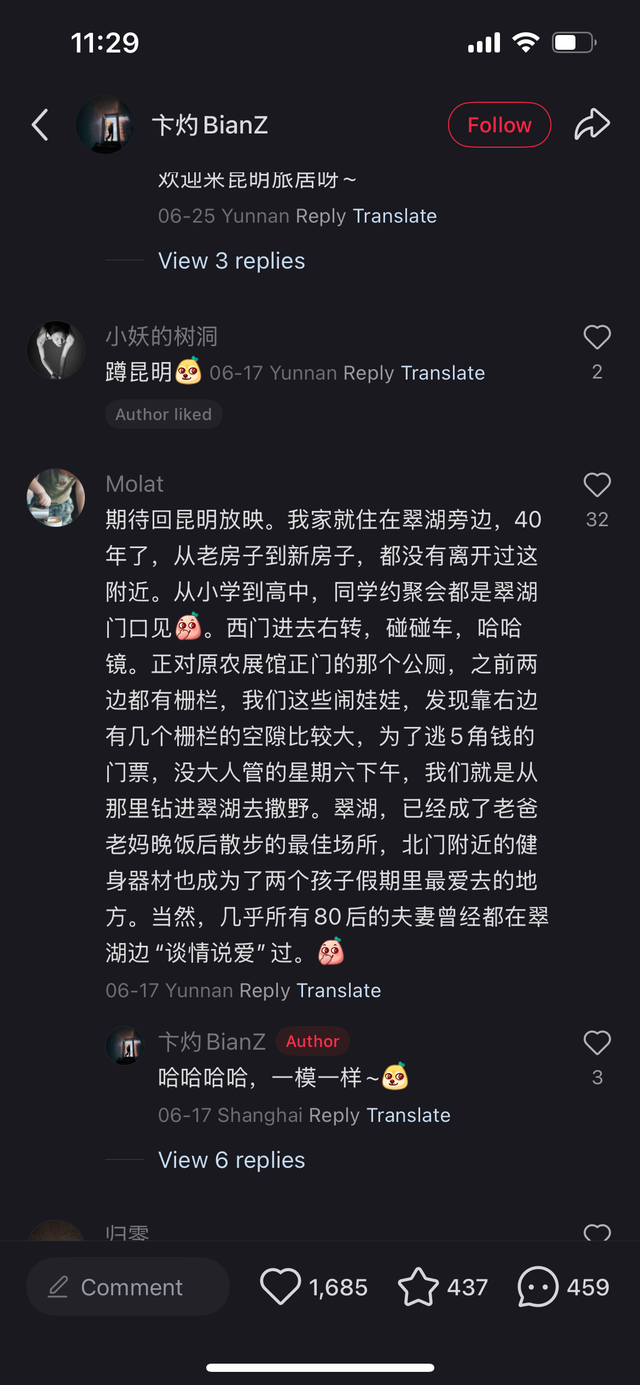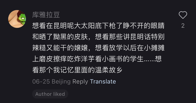 片中大量场景取景于文林街、陆军讲武堂、圆西路等本地地标,也出现了“方言梗”“烧饵块”“翠湖海鸥”等细节,浓厚‘昆明味’也唤醒了本地人的集体记忆。小红书用户@库雅拉豆 留言称,“想看在昆明呢大太阳底下睁不开的眼睛和晒了黝黑的皮肤,想看那些讲昆明话又能干的嬢嬢,想看放学以后在小摊摊上磨皮擦痒吃炸洋芋看小画书的学生……想看那个我记忆里面的温柔故乡”。小红书用户“@oulolololo”则对放映形式有了更具创意的期待:“哇塞,如果能在翠湖露天放映就更好了,以前散步有看到老爷爷用幕布投影老电影的,如果这次这么放映好像更有感觉!”这一留言获上百点赞。
