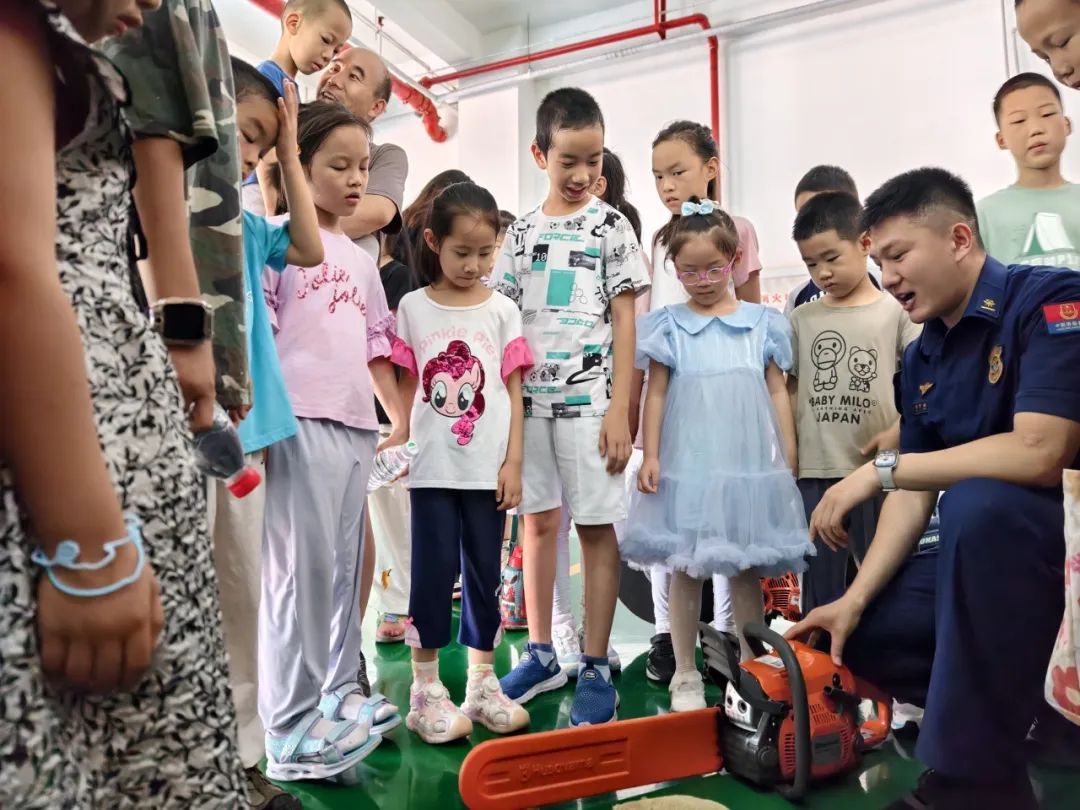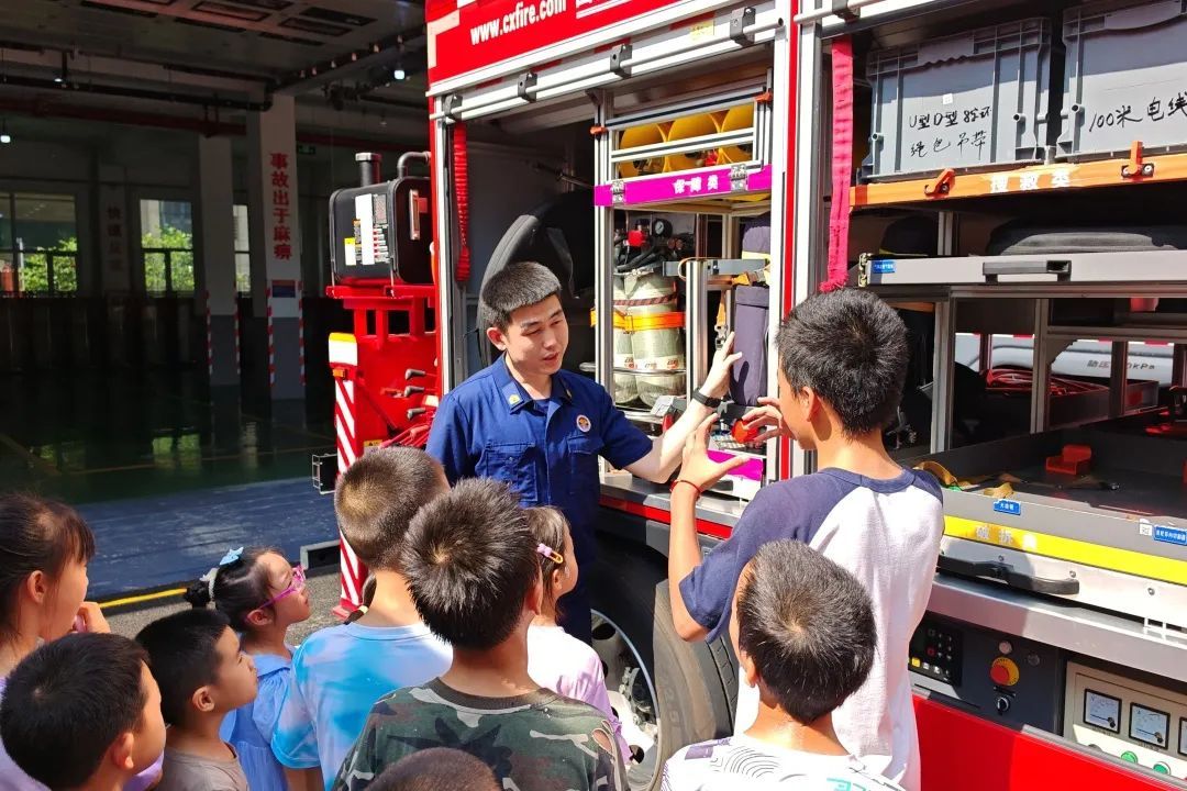 消防员变身讲解员,详细介绍了高压抽水机、高压水枪、灭火器等各式各样消防器械的功能和用途,细致演示消防车辆和器械的操作方法,大家都听得全神贯注,对消防车器械知识、安全标识、火场逃生方法等消防安全知识有了更深刻的理解和体会。