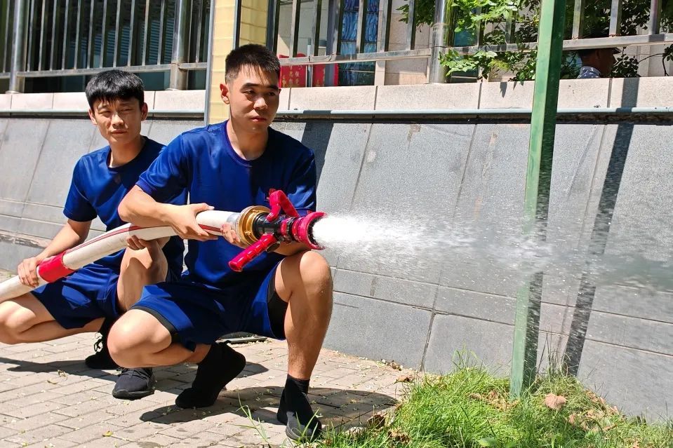 消防演练现场,消防员展示了基础灭火操作方法,两盘水带连接、模拟出水等操作行云流水,青少年们连连惊叹。在消防员的指导下,部分勇敢的青少年还亲自上手尝试连接水带,过了一把 “灭火瘾”。