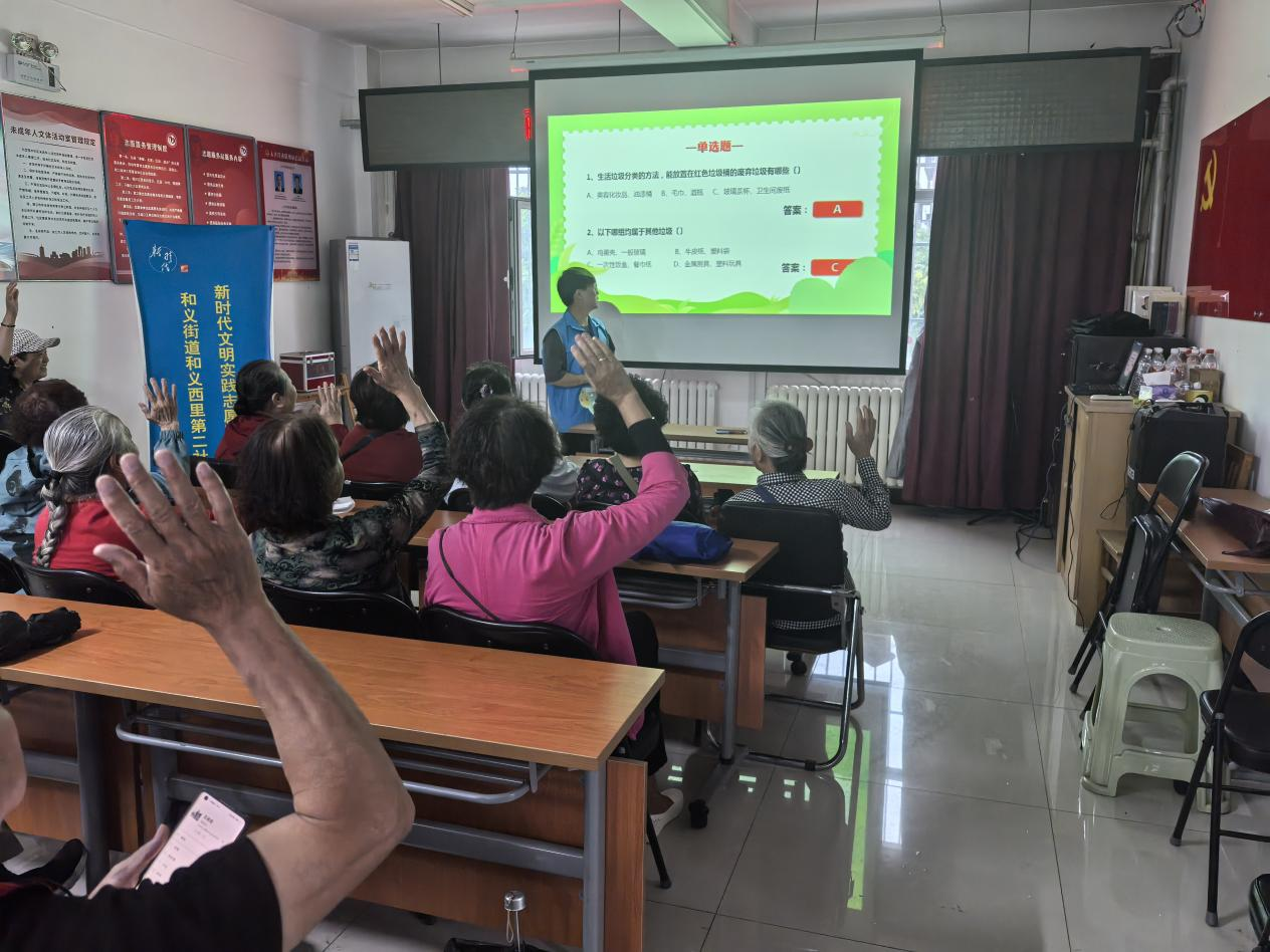 和义西里第二社区用一场垃圾分类知识竞赛点燃居民的学习热情。活动现场,社区工作人员结合北京市垃圾分类政策,以生动案例为切口,深入浅出地解读垃圾分类的意义、标准及常见误区。居民们认真聆听、积极互动,现场氛围热烈。竞赛环节中,参赛居民分组协作,从容应对各类题目,凭借扎实的知识储备高效答题。题目设计紧扣环保主题,涵盖资源循环利用等核心内容,让居民在竞技切磋中深化对垃圾分类的理解,让“绿色分类”理念更加深入人心。